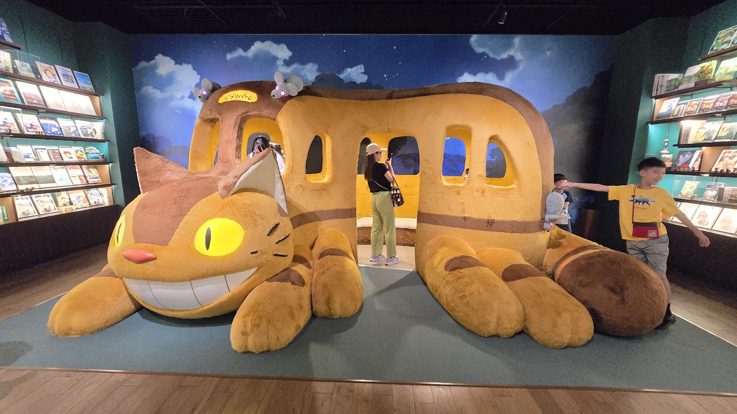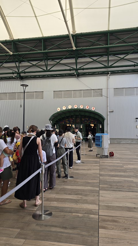 經實驗證明, 吉卜力大倉庫是這裡面 CP 值最高的. 外觀雖然就是個倉庫樣, 但裡面內容很豐富. 特別是下面這 14 個名場面的實景都可以拍照. 實景的第一站就是"千與千尋" 中的無臉男坐電車. 結果大批的人龍都在排這個, 粗估隨時有五十人以上. But, 跳過這個長龍, 其他的點都不到 10 個人, 甚至沒有人. 我猜大部分排隊的人都以為那是唯一進場的隊伍吧!