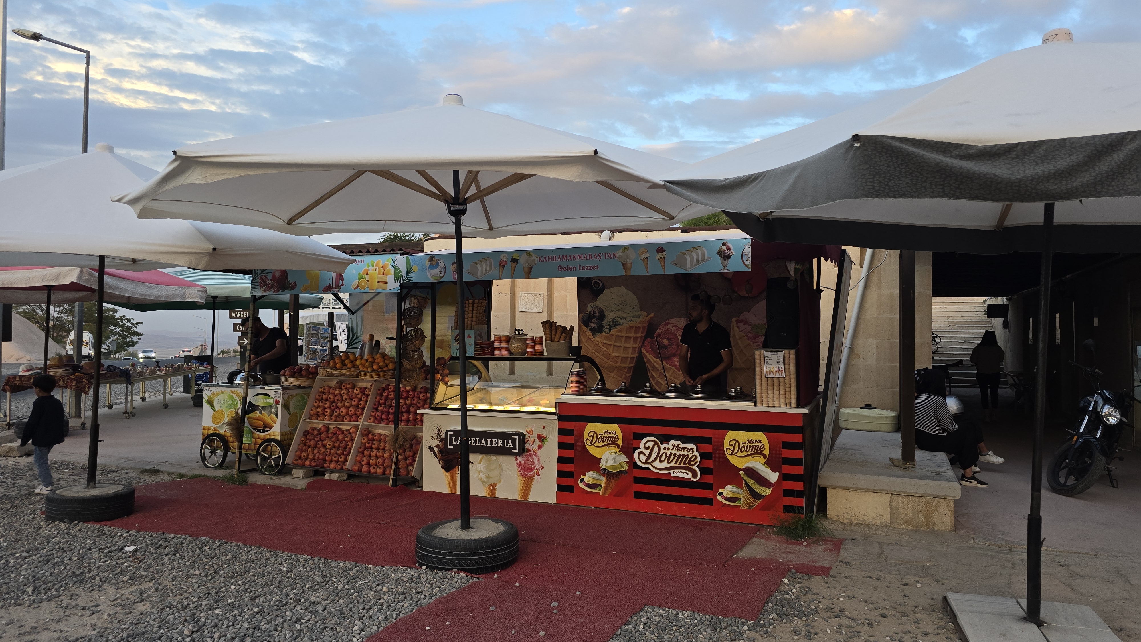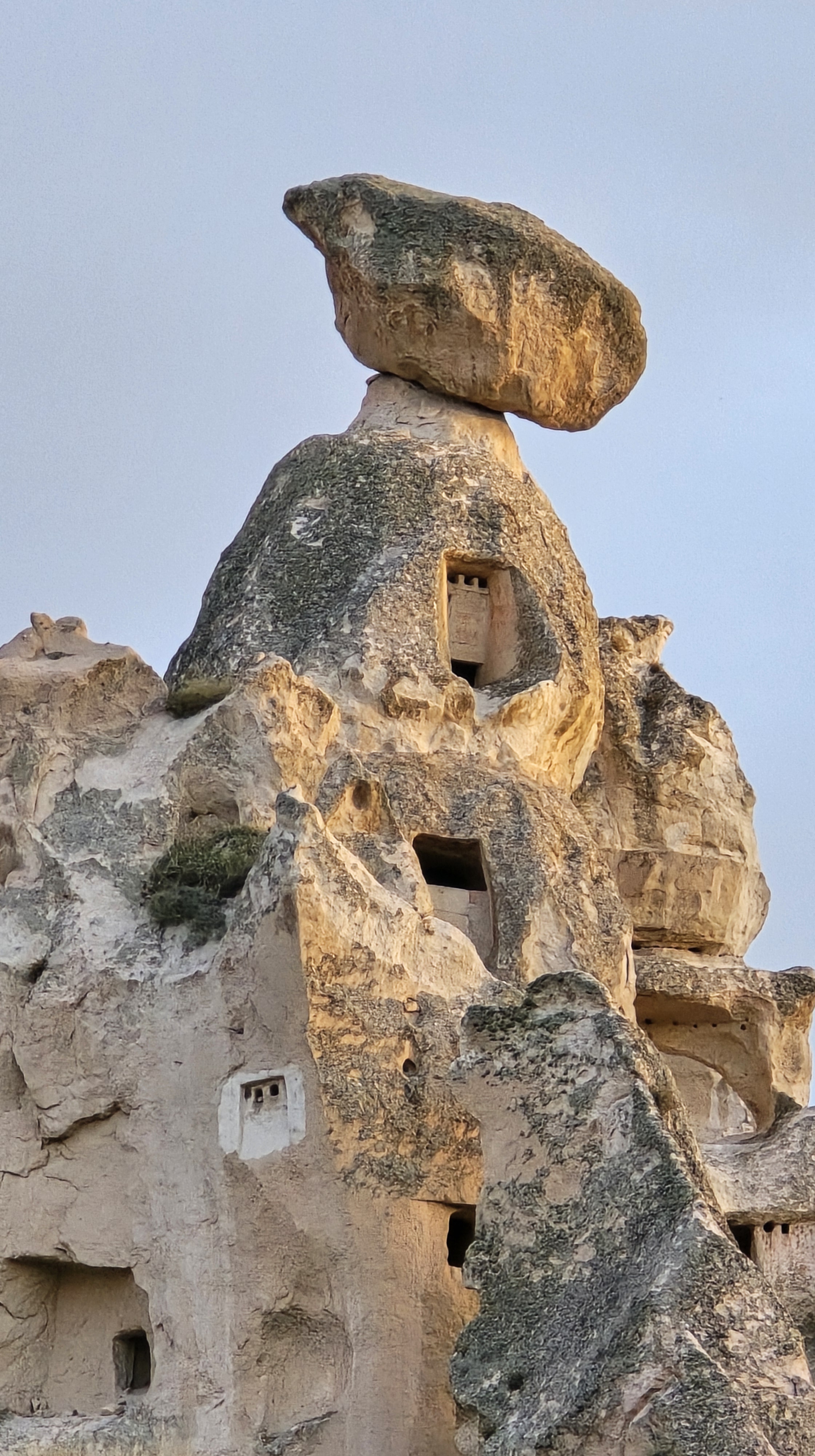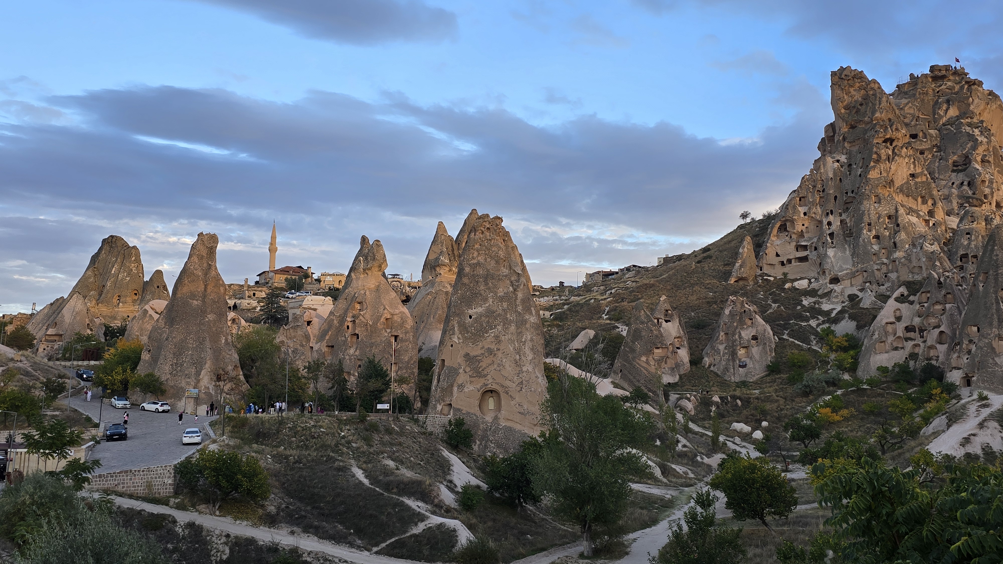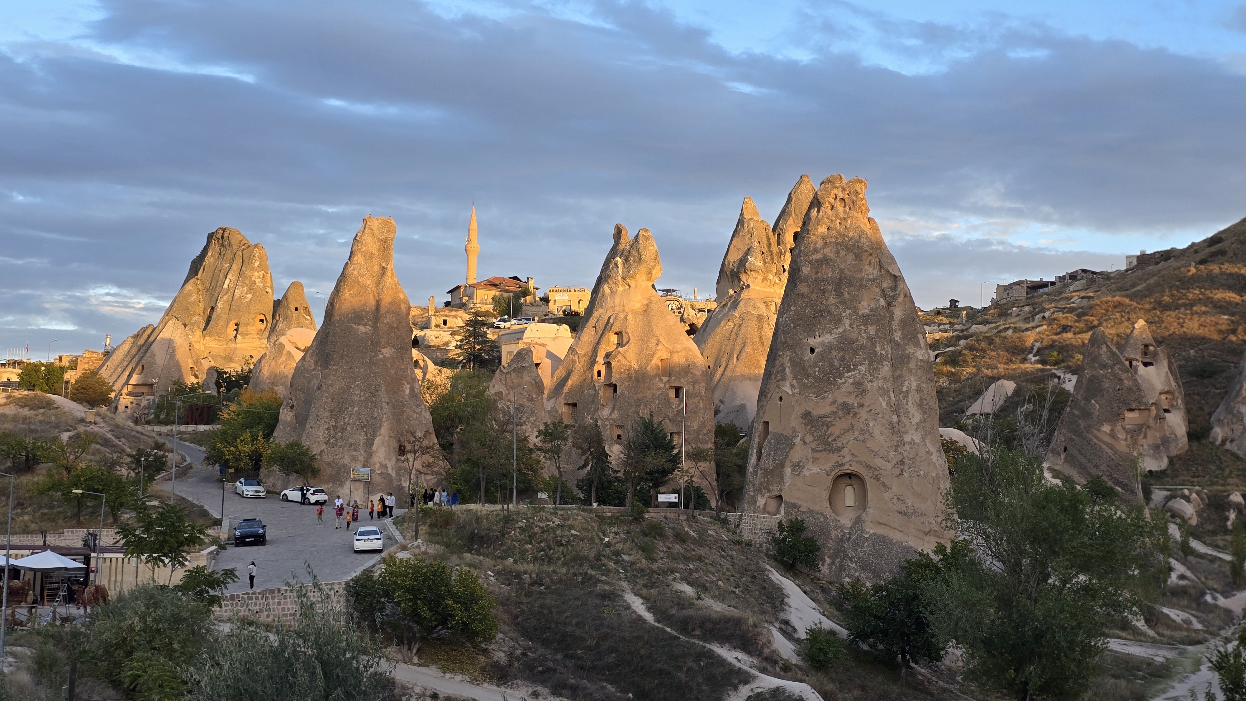 傍晚時分, 我們進入了"卡帕多其亞". 雖然此處的景色跟後面比不算最厲害. 但是對我們來說意義非凡, 因為終於來到印象中有很多奇怪石頭的土耳其了. 這裡的岩洞應該沒有住多少人. 山腳下有人做點小生意, 像是果汁吧和騎駱駝的攤位. 其他應該只剩下歷史遺跡.
