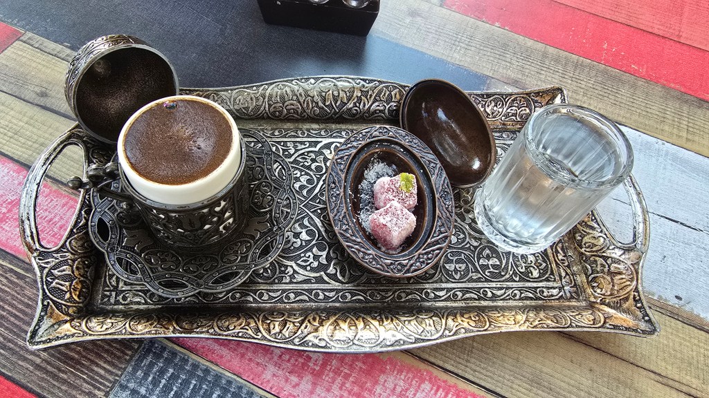 當然要喝一下土耳其咖啡。右邊那杯是水,清咖啡渣用的。