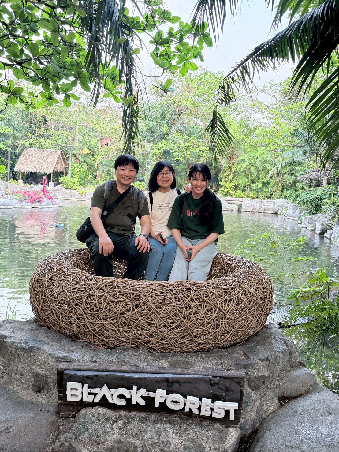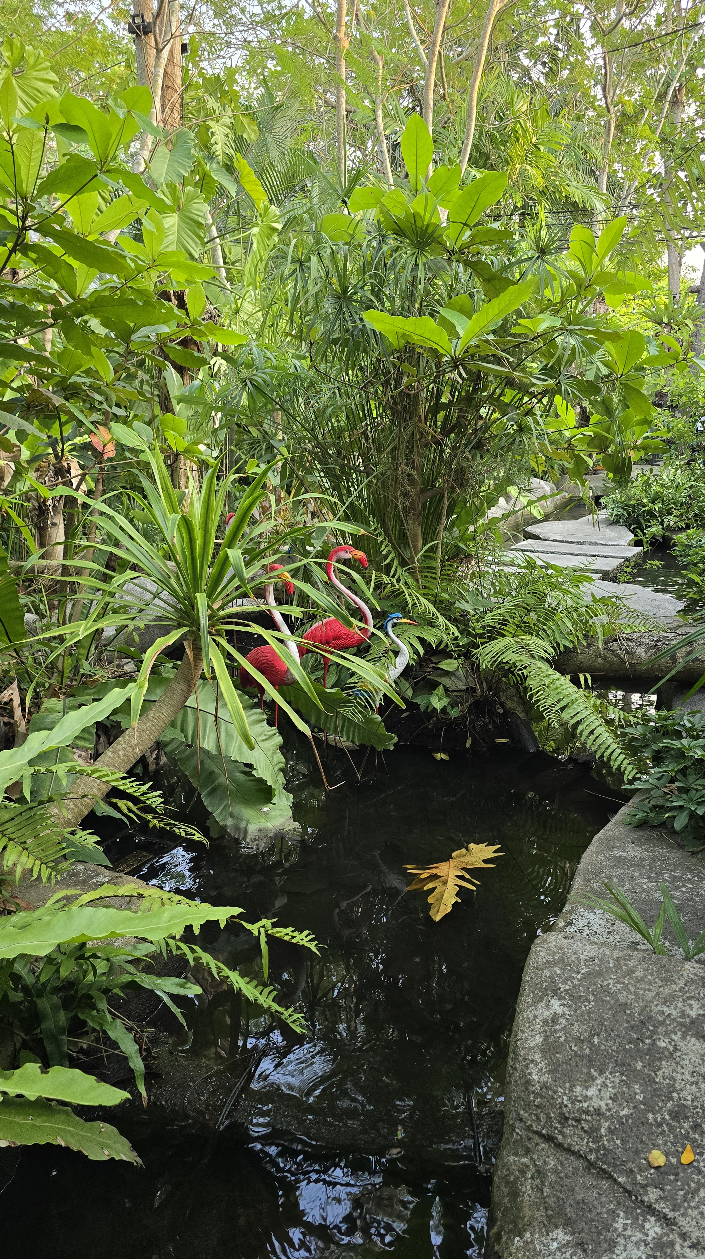 到達 Pattaya 後,參觀一個黑森林景觀餐廳。餐廳裡面有很多生態造景,假的鸚鵡、紅鶴之類的,真的動物主要是很多可以餵食的黑鯉魚。植物造景還滿不錯的,營造出柳暗花明的感覺。