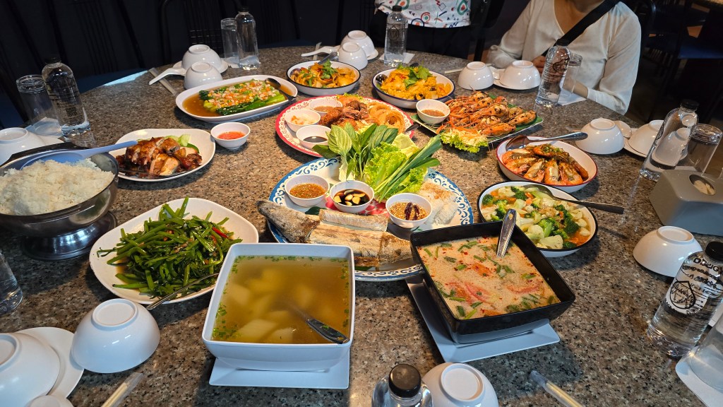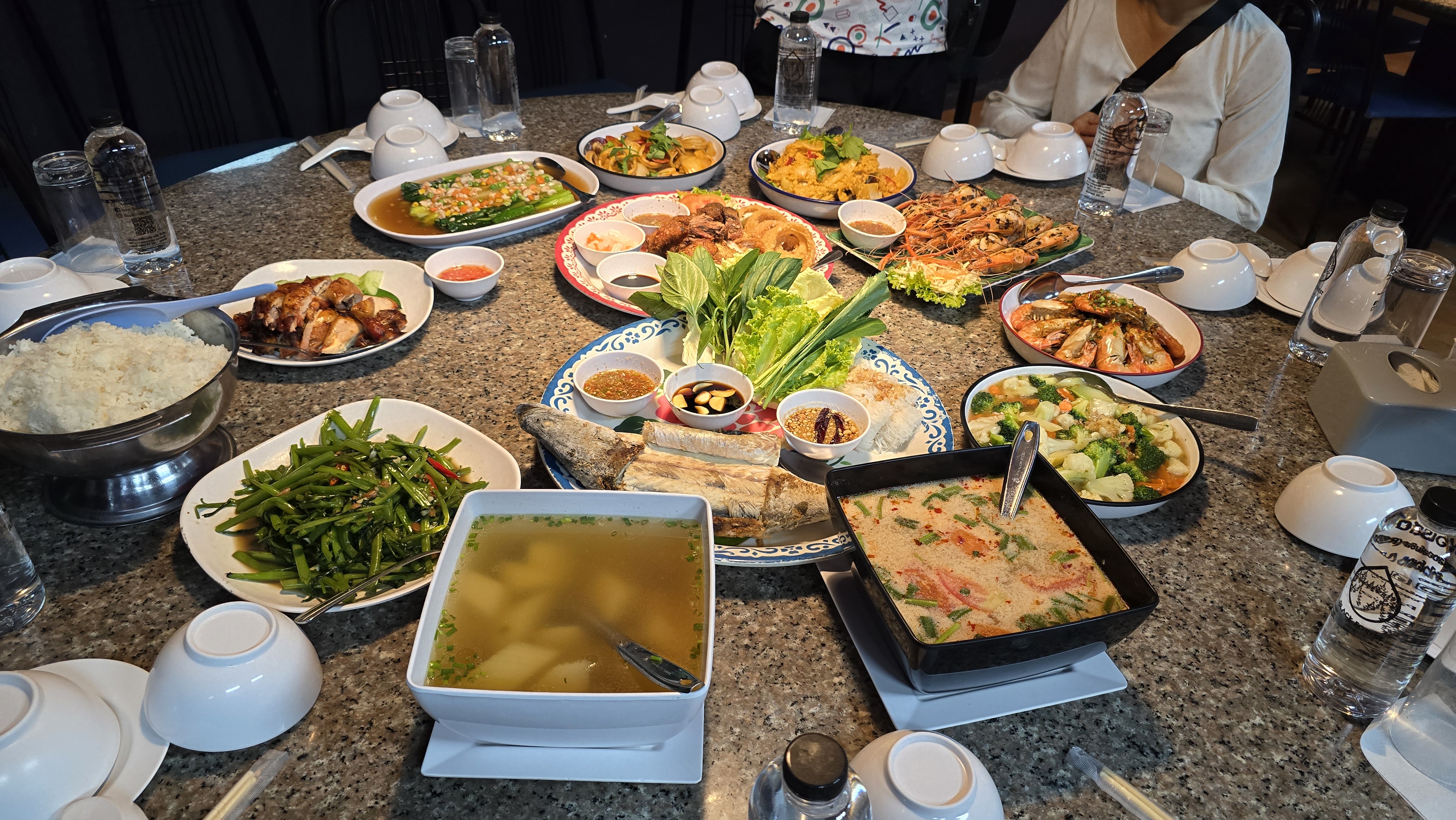 第一個景點是餐廳,我們先到了家"樂來順"用午餐。口味還行,其中冬蔭功酸辣湯成了我後面的填飽肚子的主餐之一。正式的主菜是火山排骨,造型驚豔,吃起來就是排骨。後續到處都看到這種排骨塔,相形之下這座並不高。