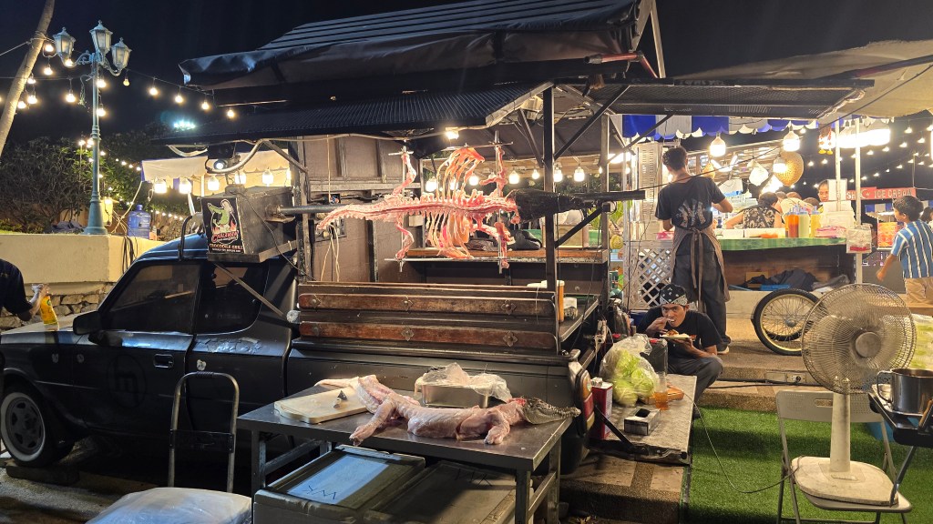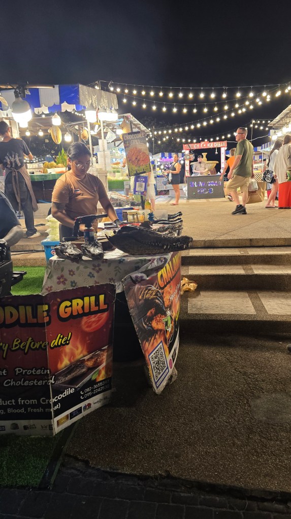 步行街的入口處有個小夜市。賣鱷魚排的攤販還把整隻鱷魚骨肉拆分後展示。後續幾天也有很多家賣鱷魚的,不過剝皮拆骨的僅此一家,台灣夜市應該也是絕無分號。下圖右遠方有個土耳其冰淇淋的攤子,看得出他的生意門可羅雀。和十公尺外的另一家冰淇淋攤車的人龍形成強烈對比。我想大熱天民眾只想趕快吃到冰,不想跟老闆玩遊戲吧。