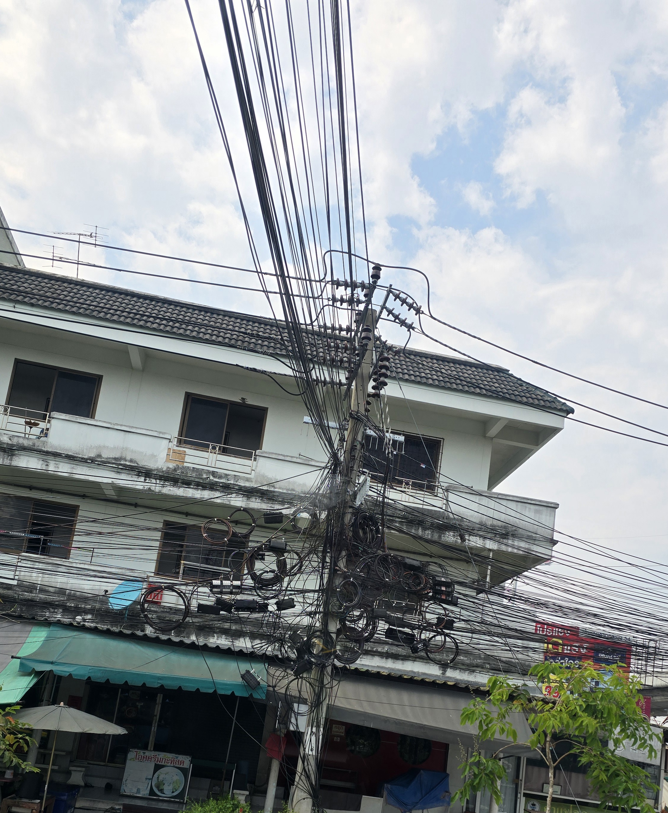 因為起得太早,這一整天都很好睡。出了曼谷素萬那普 (BKK) 機場,身上的羽絨衣和長袖衣服馬上都得脫掉剩短袖。除了氣溫,另一個異國風情是電線桿。電線桿上的電線來回纏繞出超現實的效果,跟越南的拓樸複雜度似乎在伯仲之間。
