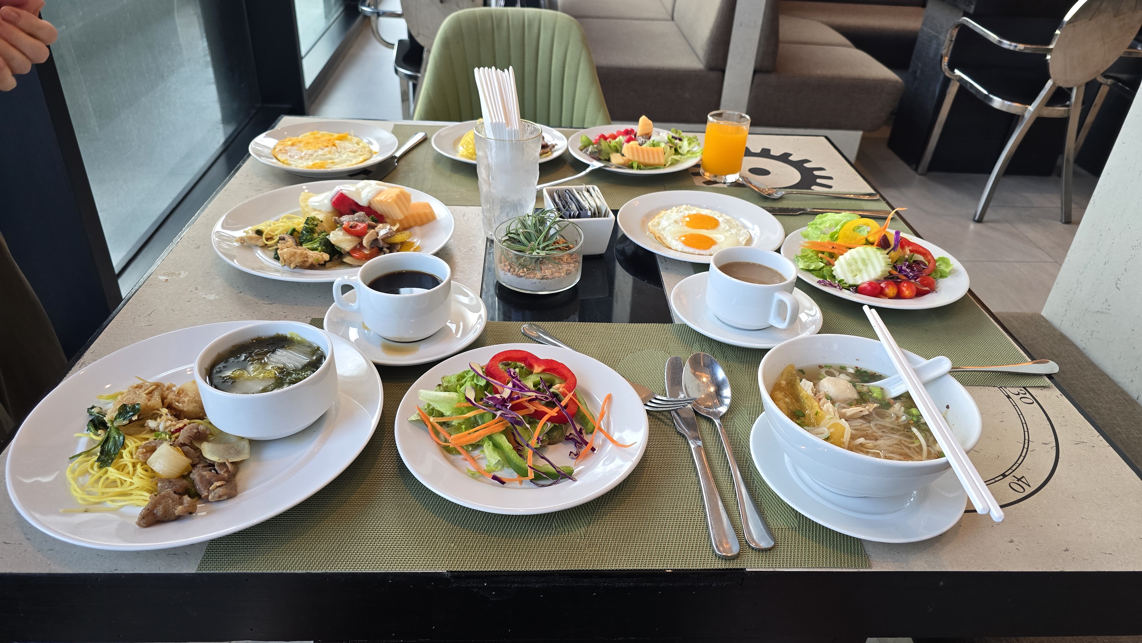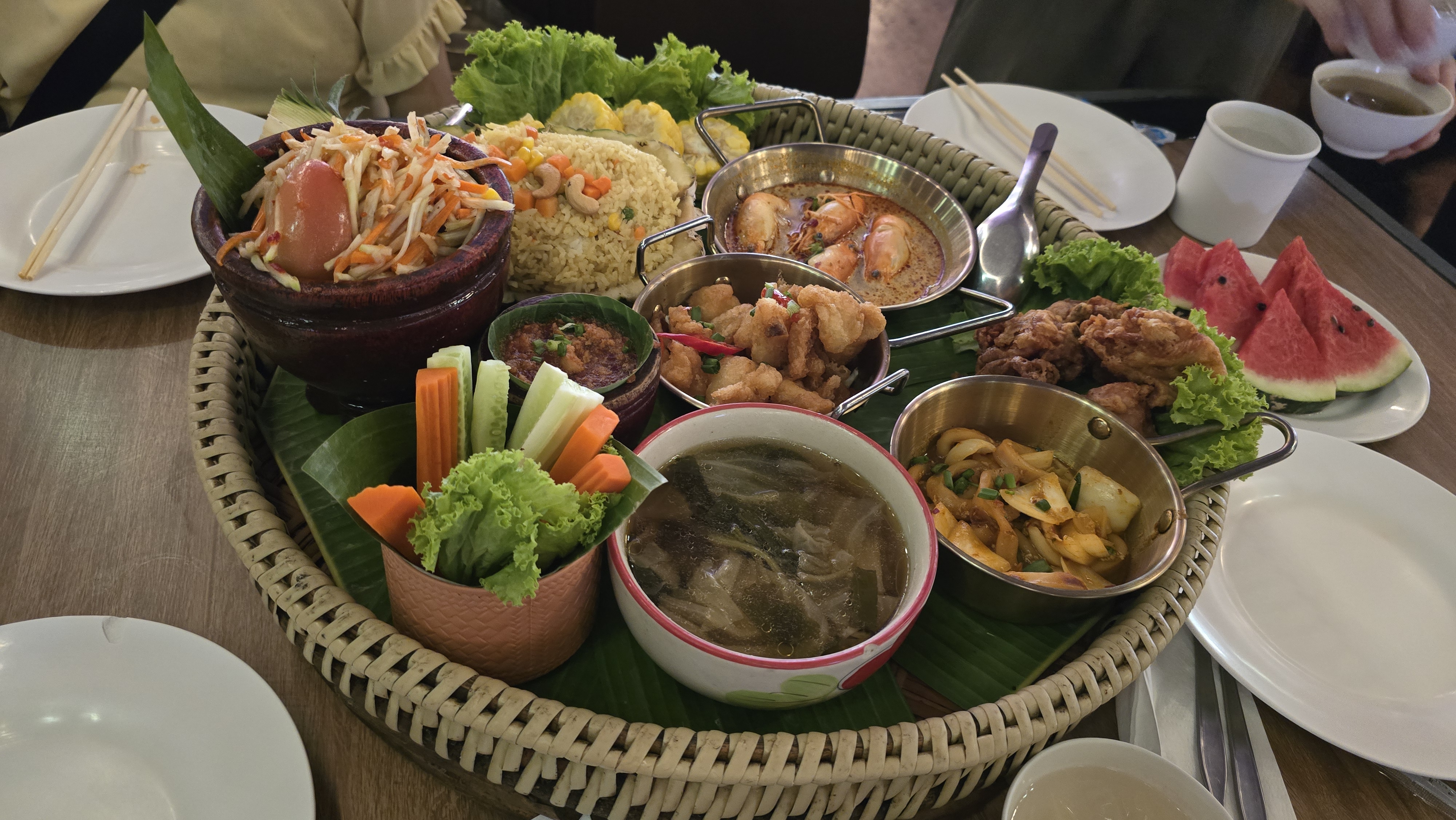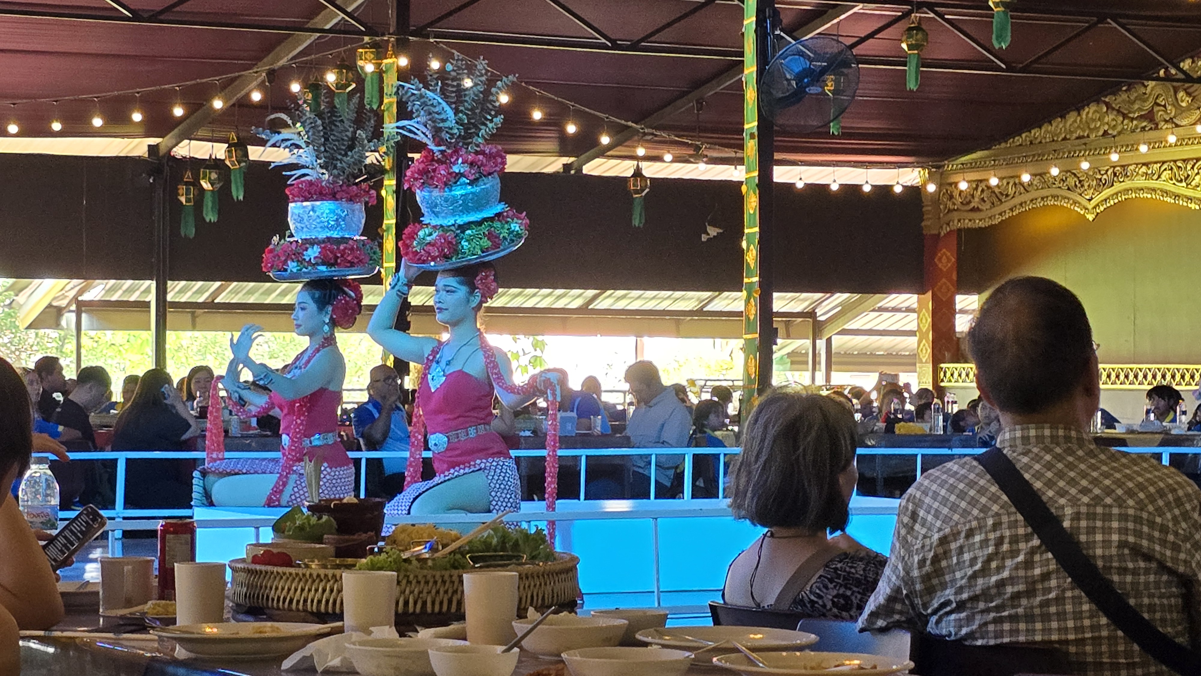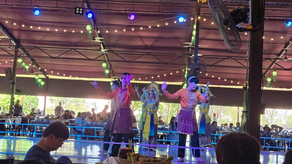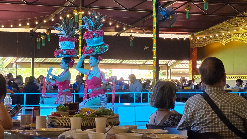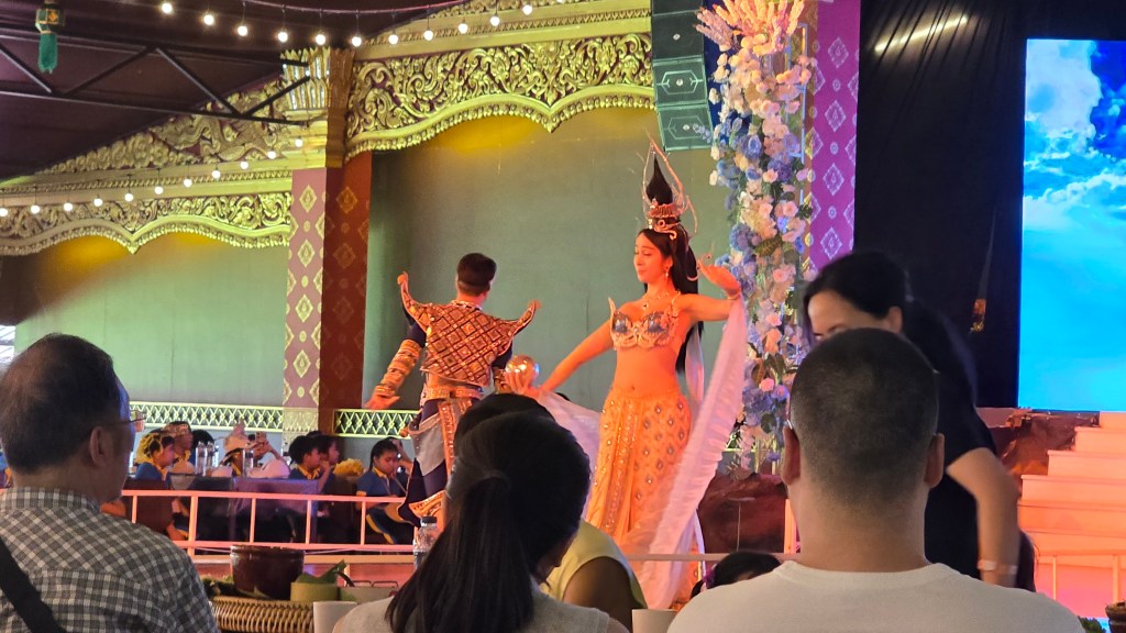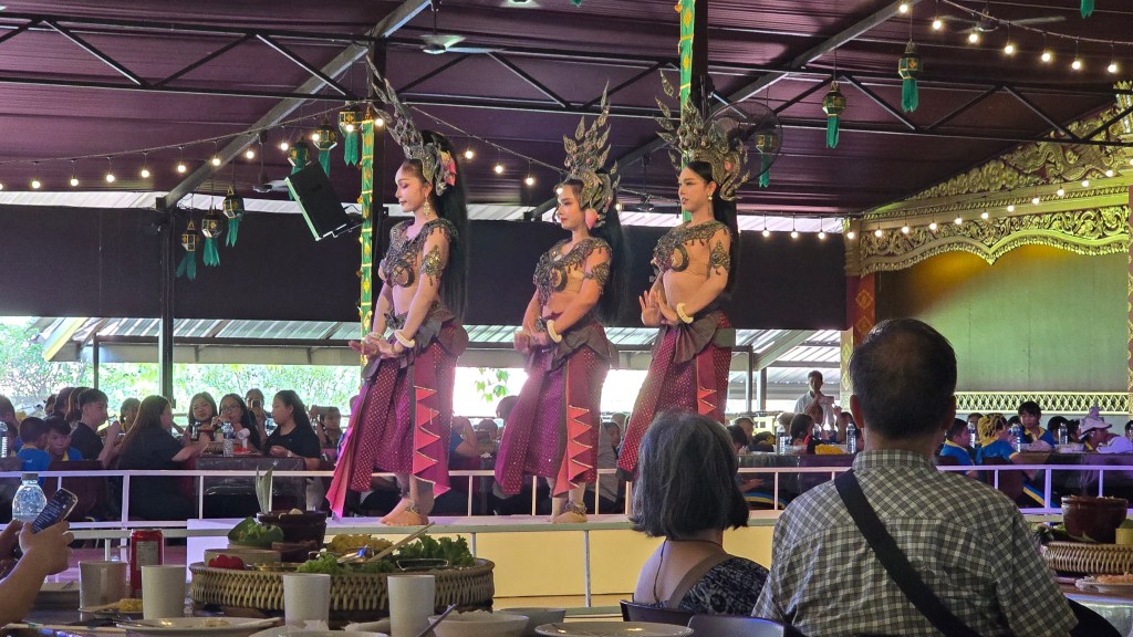 中午邊看表演邊吃帝王餐。用餐的遊客相當多,吃的也都是同一套餐。因為是大量製作吧,這些餐有點放涼了,口感一般般。但有現做的米粉湯可以無限拿,所以我主要是吃米粉和冬蔭功湯。