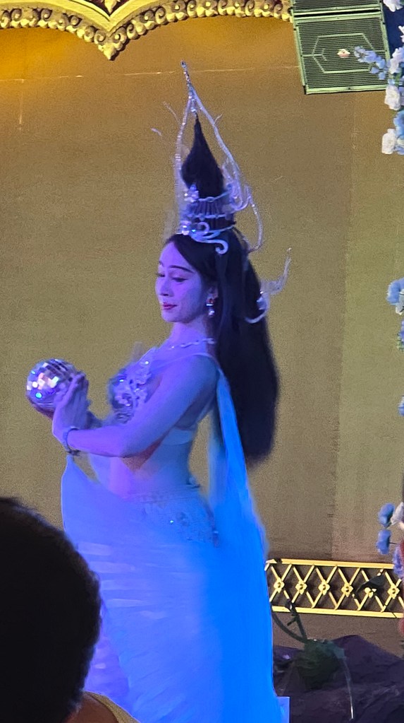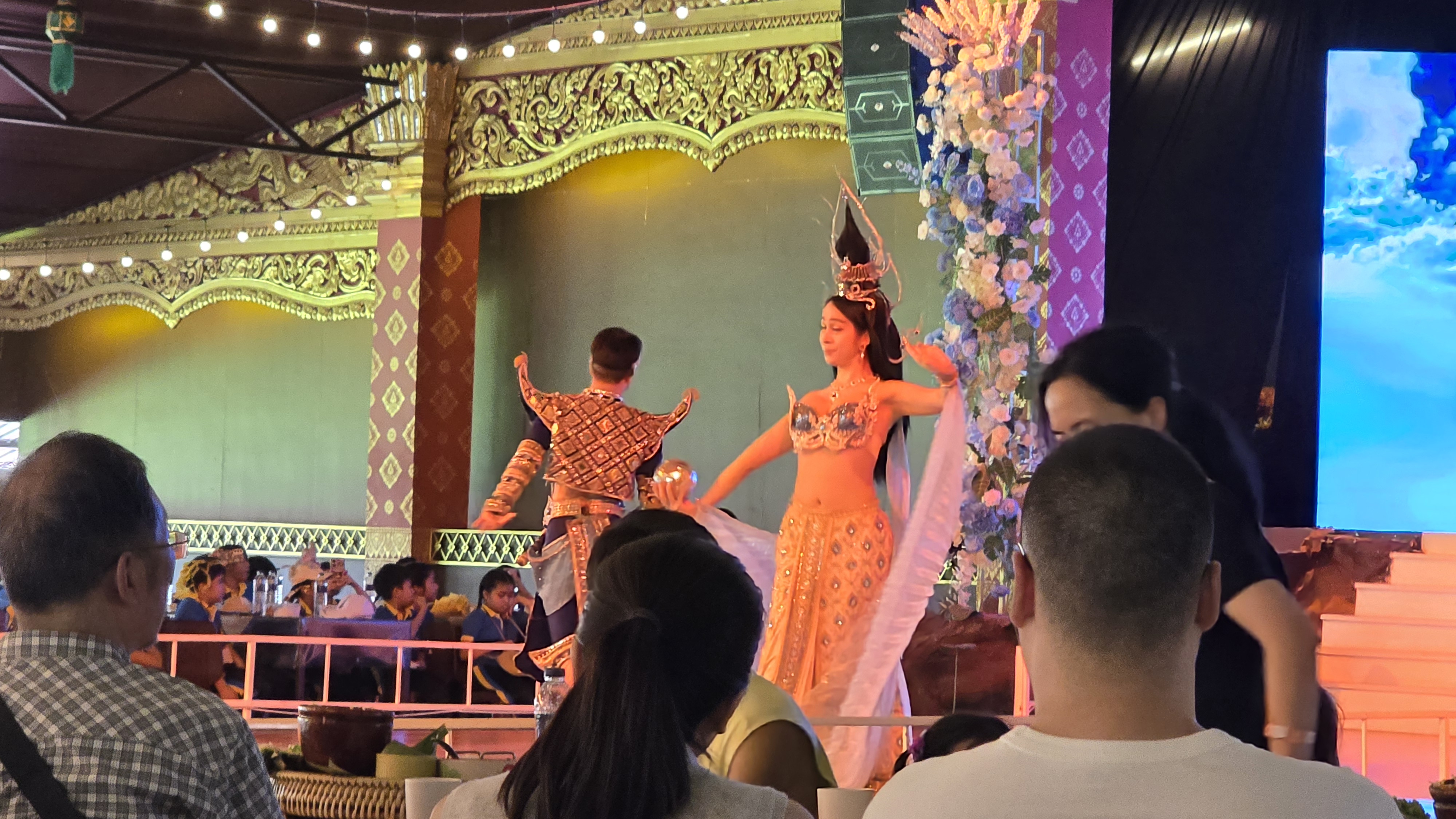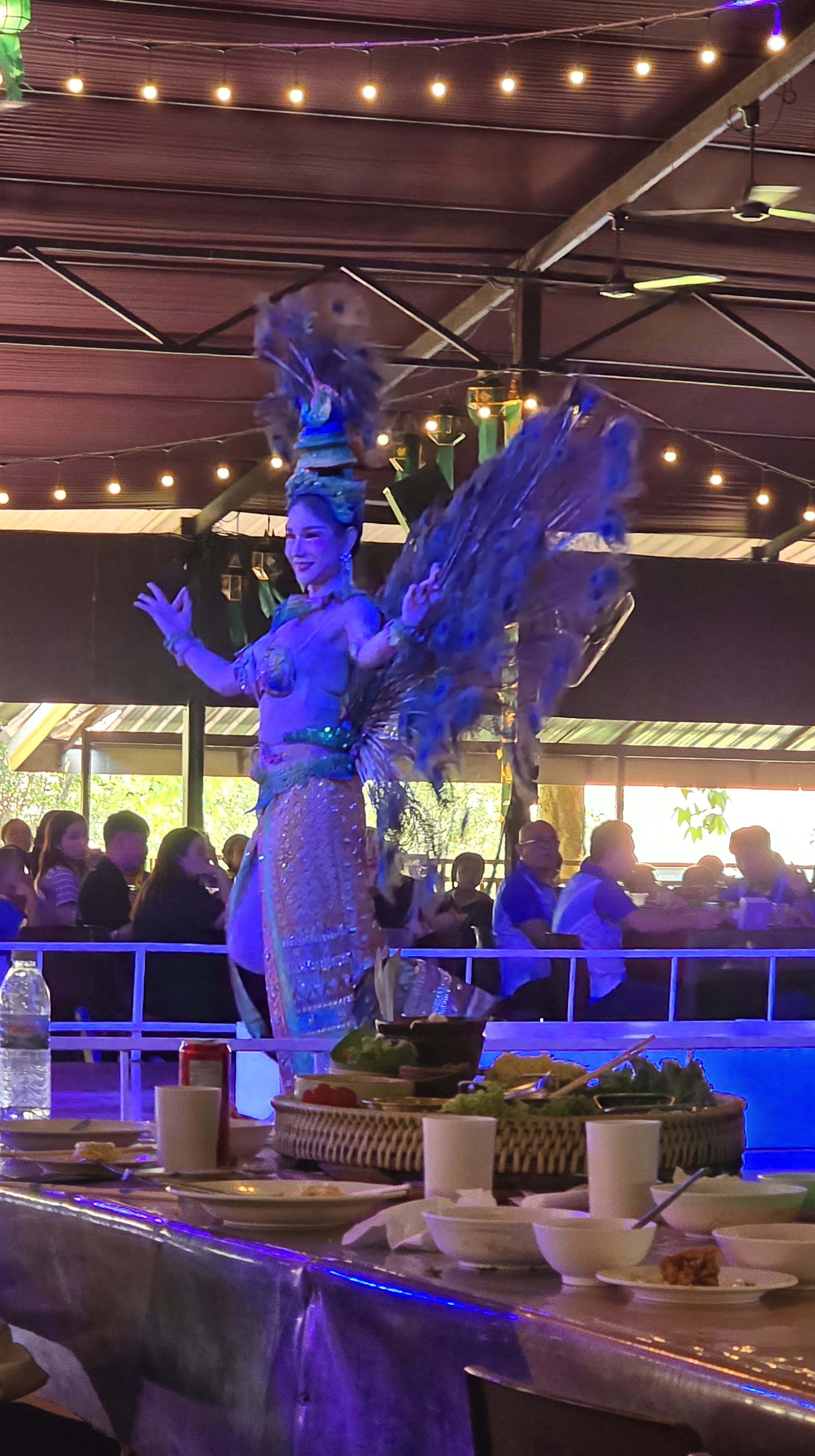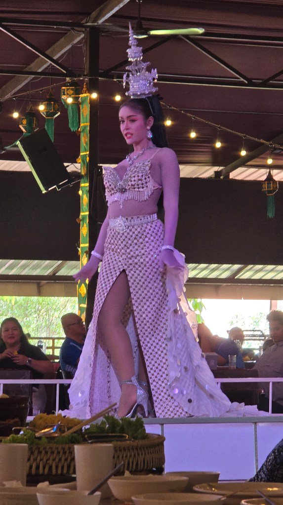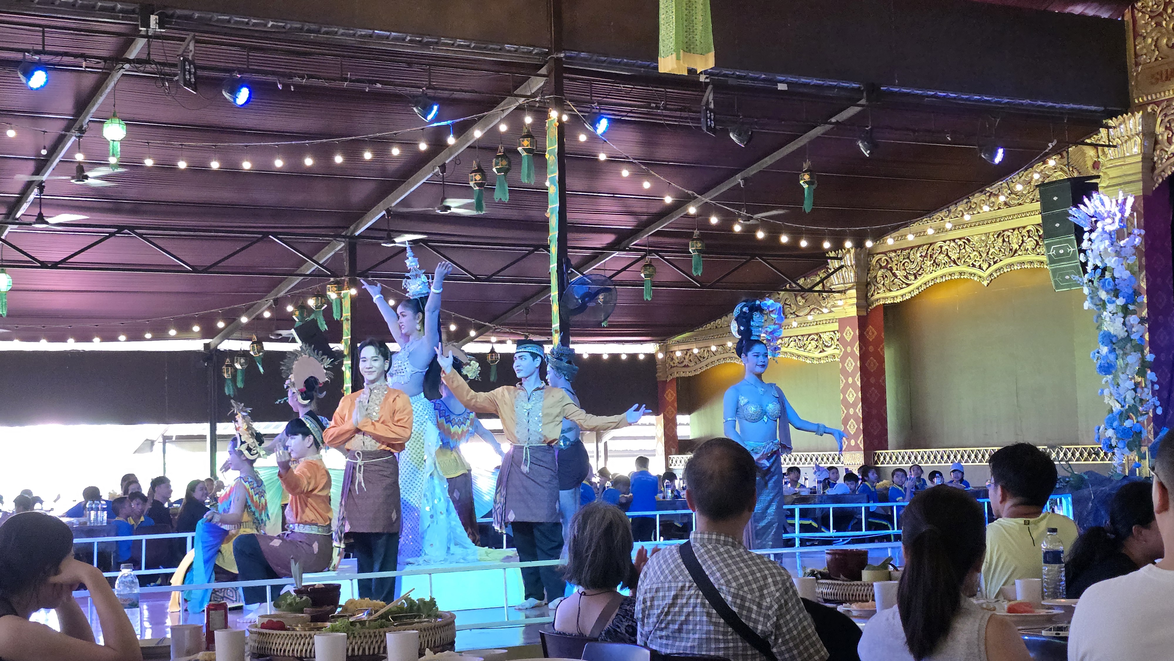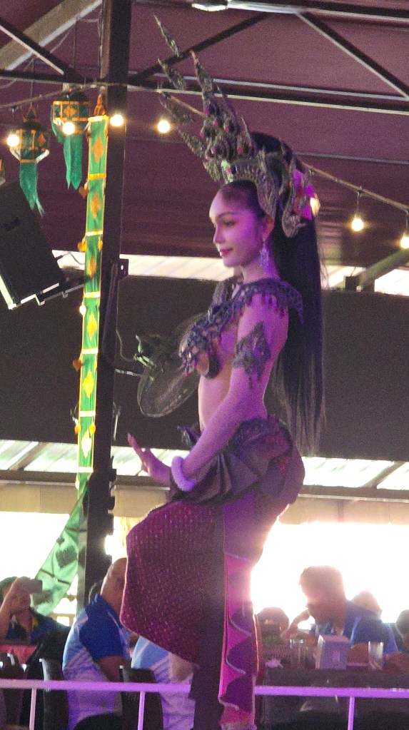 舞台上的表演動作很簡單,但是服裝相當華麗。如果這些表演都有考據的話,我可以歸納出泰北擅長孔雀羽毛當裝飾,東北區則是有高冠和薄紗。