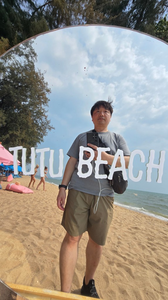 找到座位後也沒有很優閒。新鮮椰子雖然清涼又鮮甜,但是躺在隔壁的老兄很努力地在滑手機刷短影音。光是抗日神劇都來回刷兩三次了,可謂度假不忘救國。後來他自己也覺得太無聊走了,環境瞬間清淨不少。還好這樣的人算是少數。