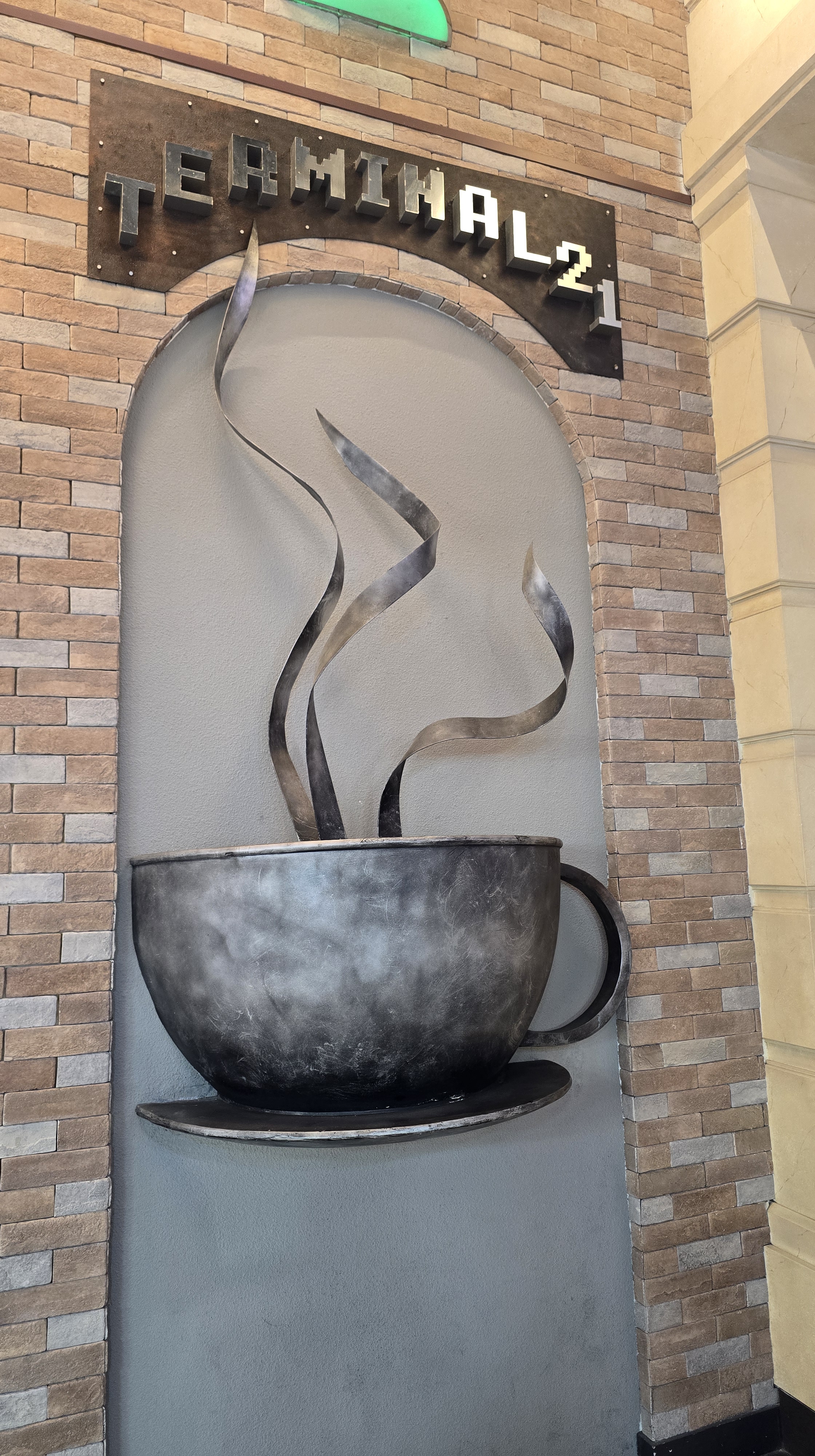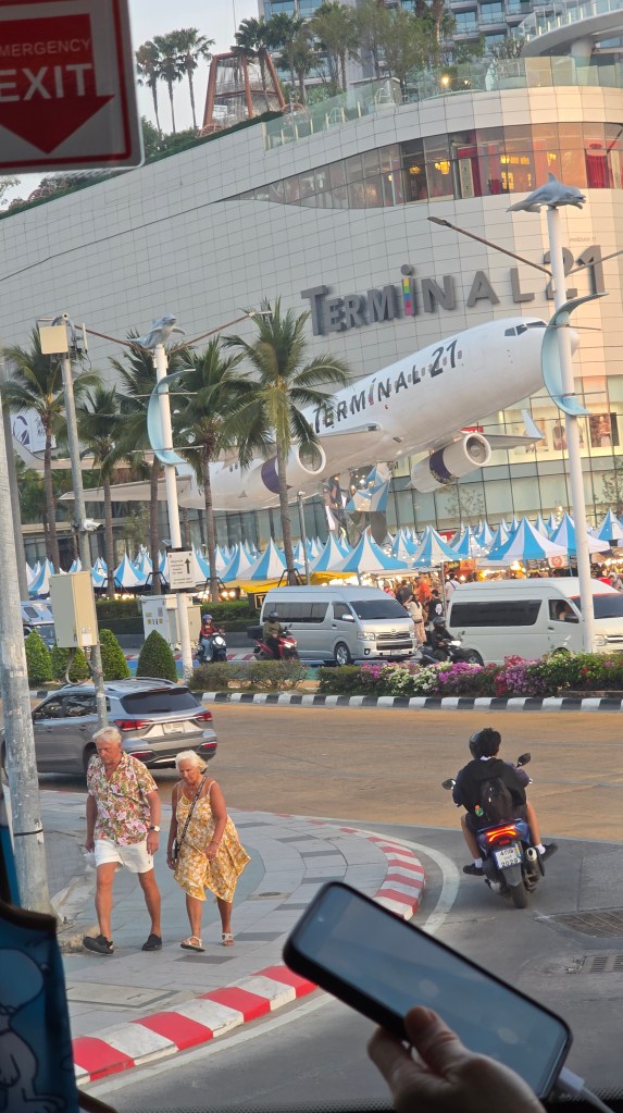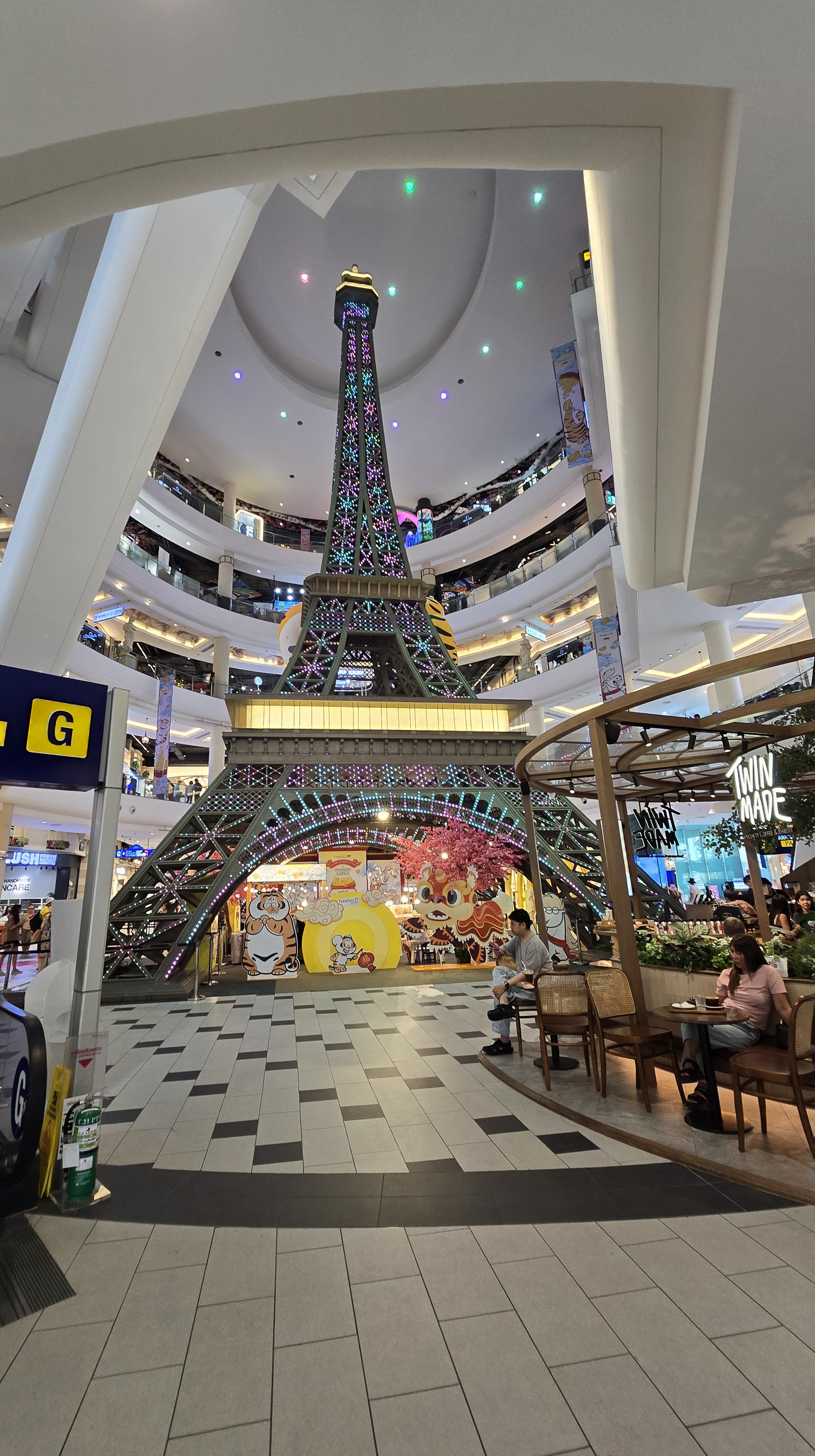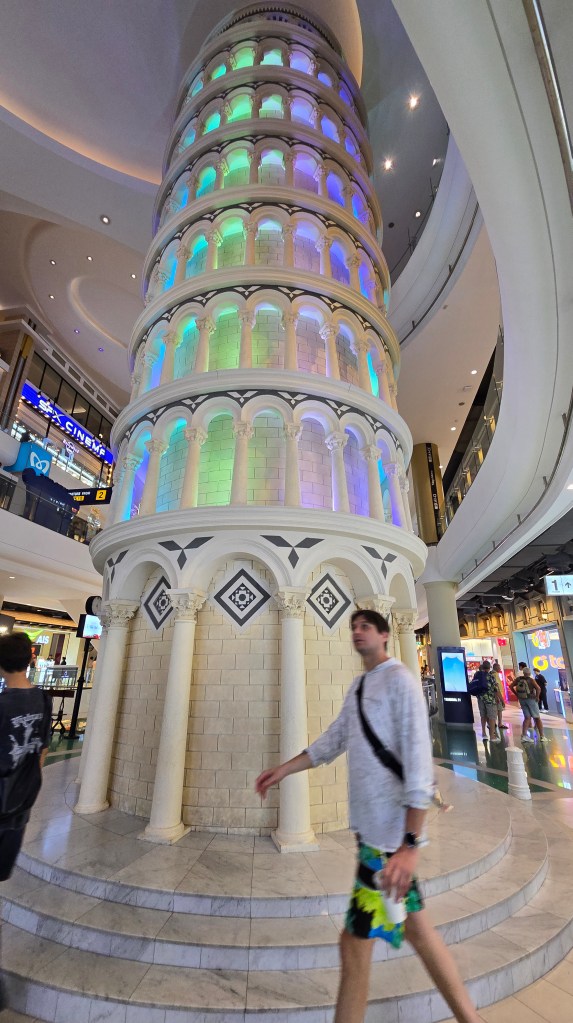 從海灘離開,我們來到 Terminal 21 商場。它以航廈為寓意,所以每個入口都叫 gate,每層樓也都用國際城市來命名。像是東京、倫敦、巴黎之類的。巴黎就以巴黎鐵塔做代表。其中義大利似乎是例外,有比薩斜塔,也有威尼斯和羅馬的象徵。