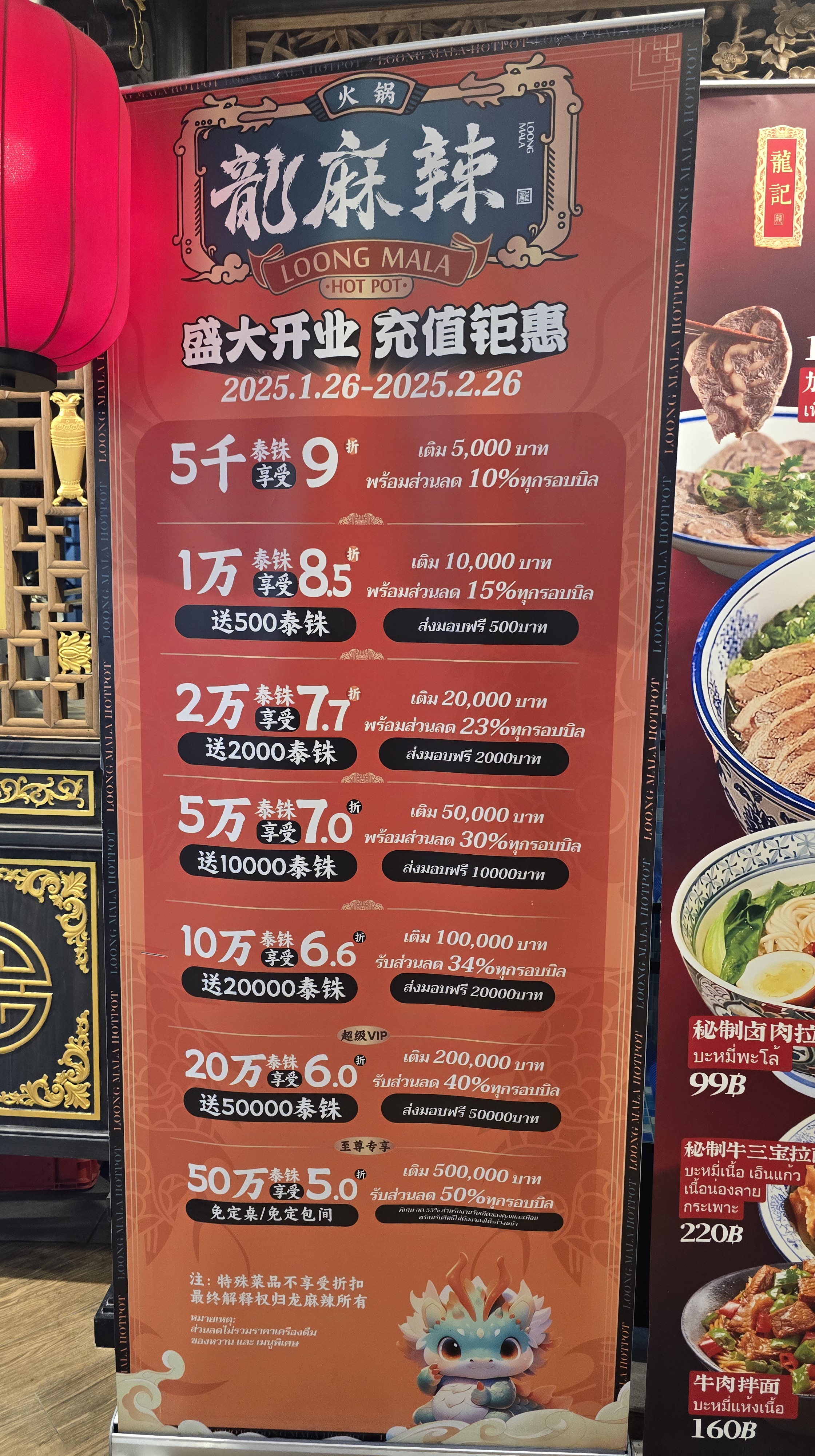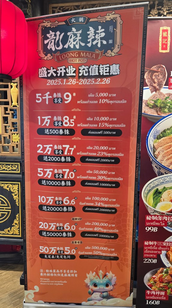 在 3 樓的美食街需要儲值,沒用完可以再退錢。有一家中式料理 “龍麻辣"居然有儲值五十萬的 “至尊專屬優惠" 選項,真是快笑死了 (上圖紅色招牌),花這麼多錢是入股了吧。