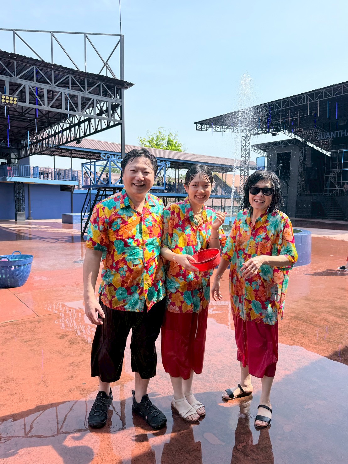 故事講完,報名自虐的人要換上另一套花花的服裝作為識別。然後在廣場上開打。其中,有個男扮女裝、非人妖但是虎背熊腰的工作人員負責炒熱氣氛,瘋狂攻擊所有人。除了大家都被潑成落湯雞,女兒還戰損涼鞋一雙。還好當場買新的也只要 290 泰銖。