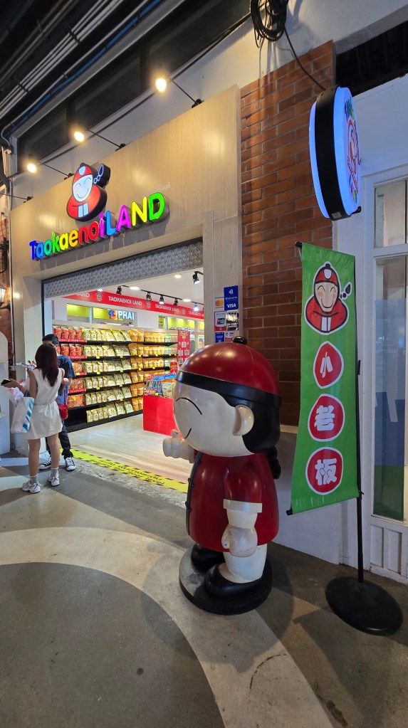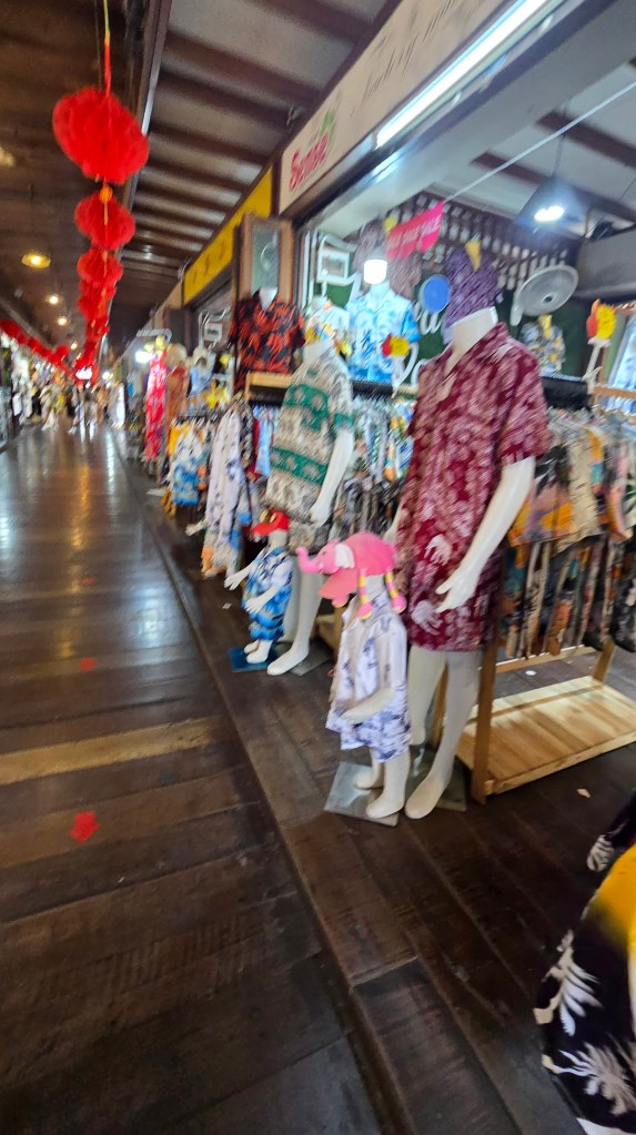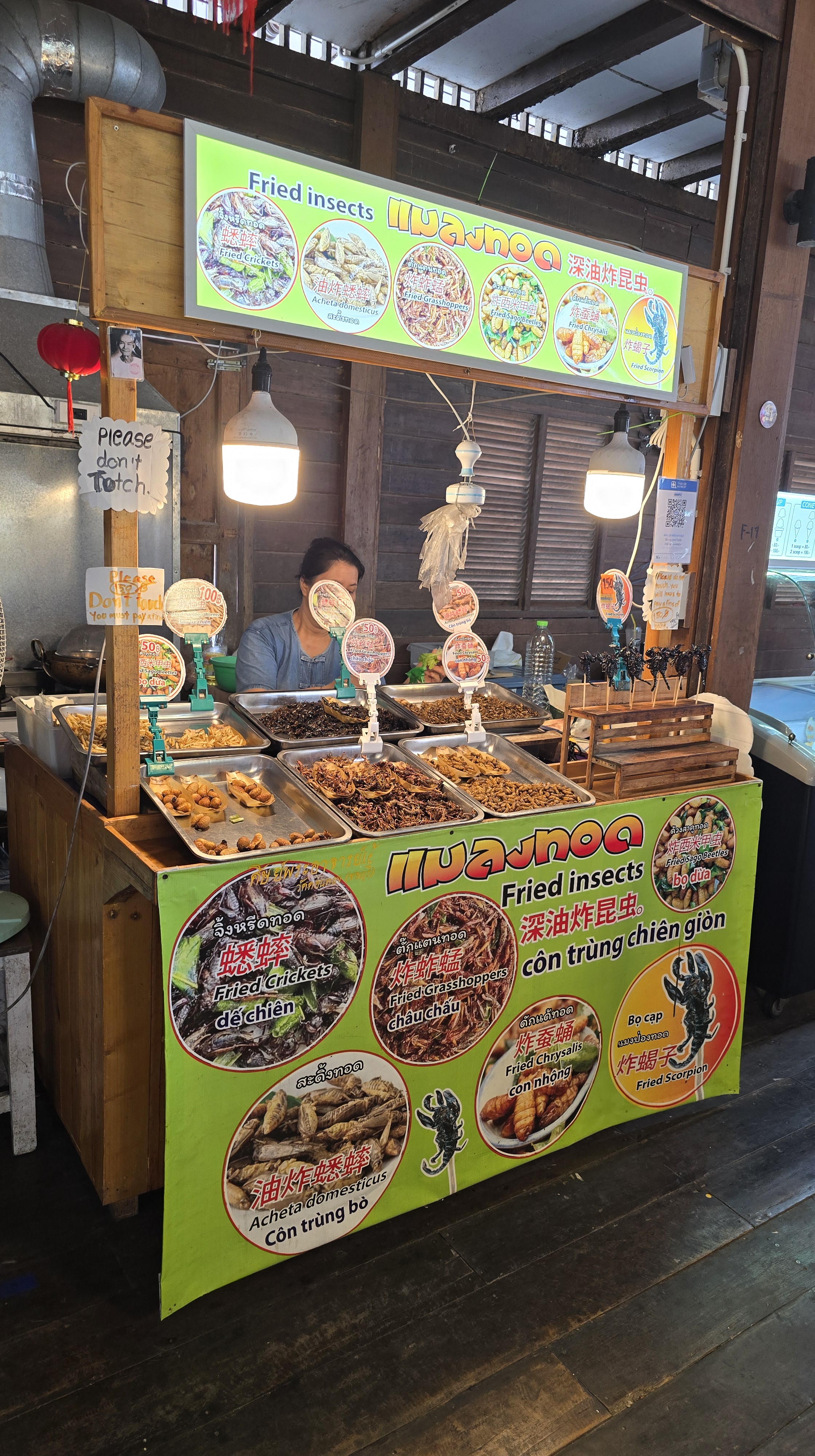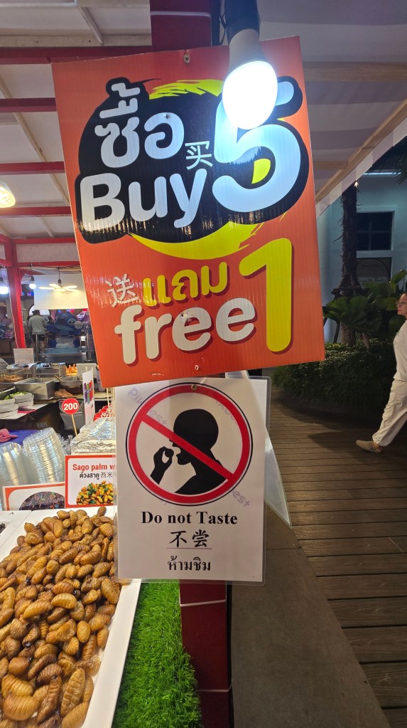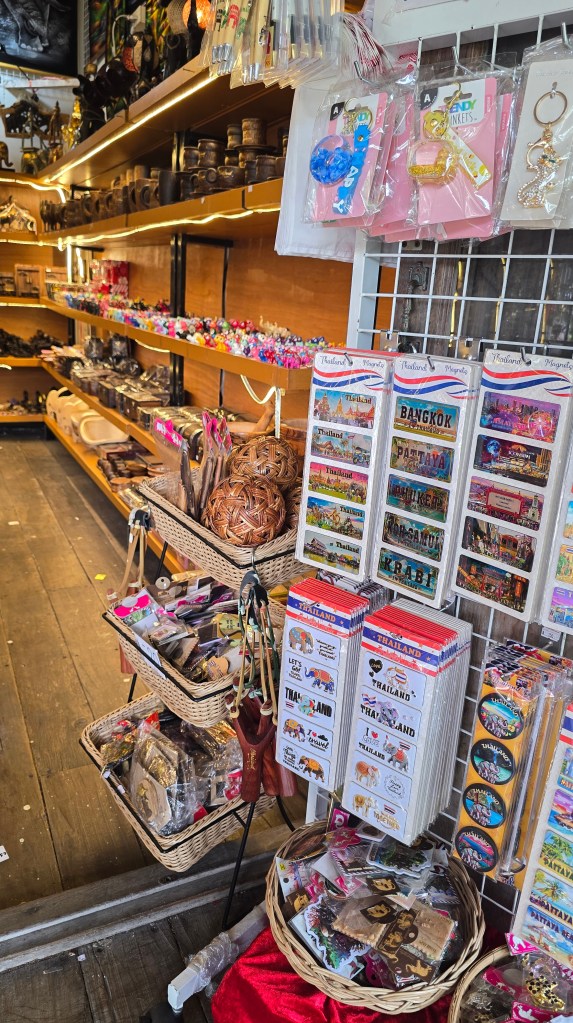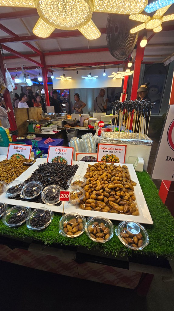 這邊的店家主要賣是賣小玩意兒、衣服、紀念品。其中吃的東西比較特別,雖然後面也常看到,不過這邊是初次見面,比較震撼。像是炸蠍子150、炸螃蟹100、鱷魚肉串 40,芒果印度將餅 50、泰式奶茶30/40/50。基本上都相當便宜。至於芒果糯米飯,我從來沒吃過,有點想試試看但又怕踩雷。這個先忍痛跳過,昆蟲因為在雲南吃過了,跳過就不遺憾。