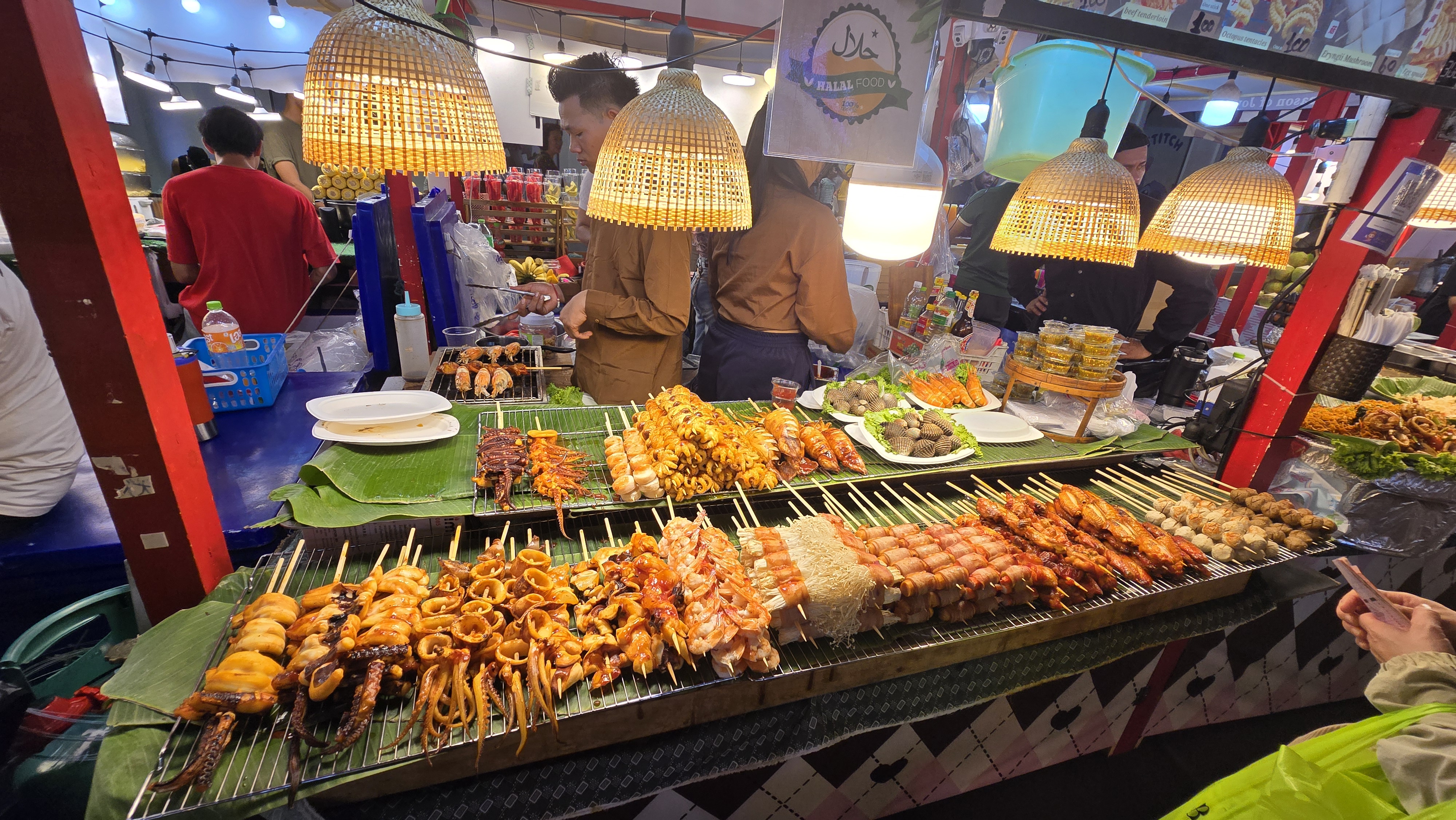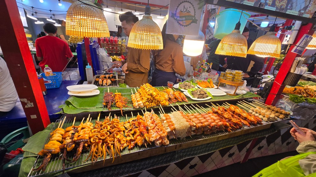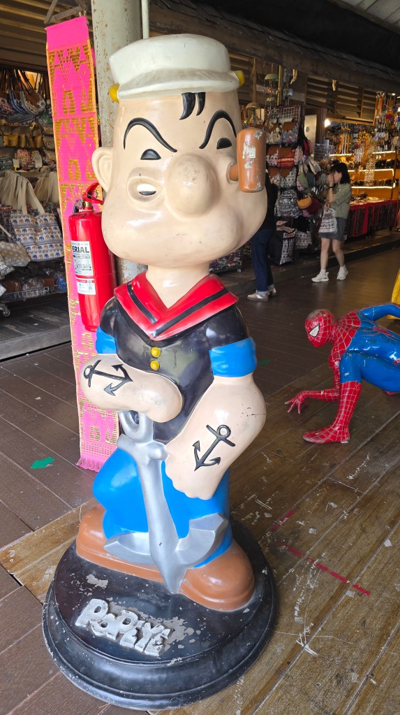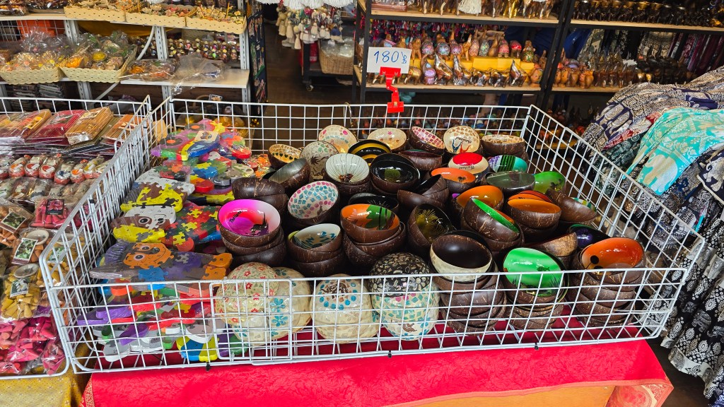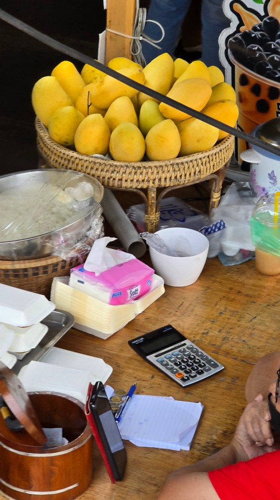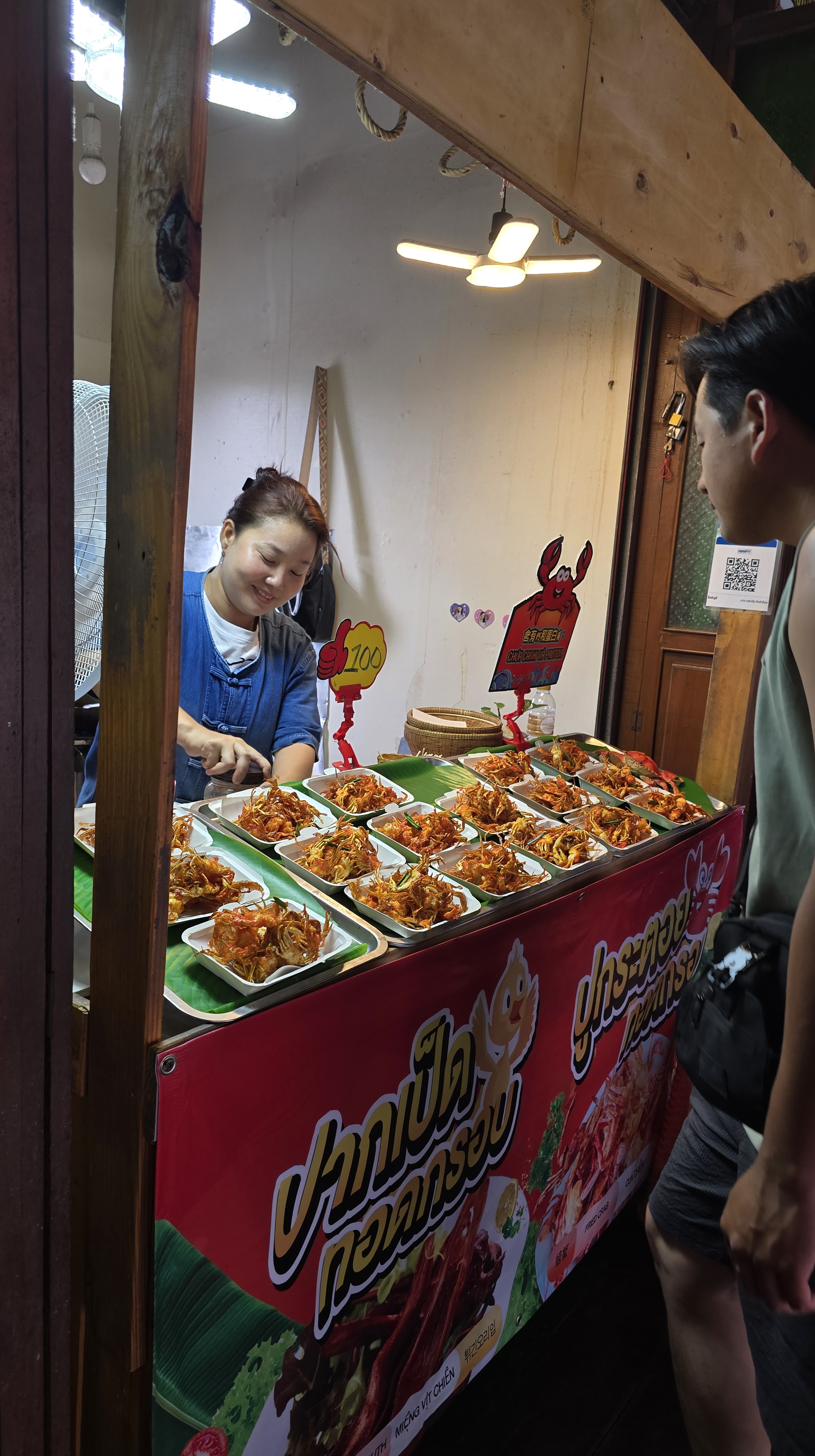 這邊的店家主要賣是賣小玩意兒、衣服、紀念品。其中吃的東西比較特別,雖然後面也常看到,不過這邊是初次見面,比較震撼。像是炸蠍子150、炸螃蟹100、鱷魚肉串 40,芒果印度將餅 50、泰式奶茶30/40/50。基本上都相當便宜。至於芒果糯米飯,我從來沒吃過,有點想試試看但又怕踩雷。這個先忍痛跳過,昆蟲因為在雲南吃過了,跳過就不遺憾。