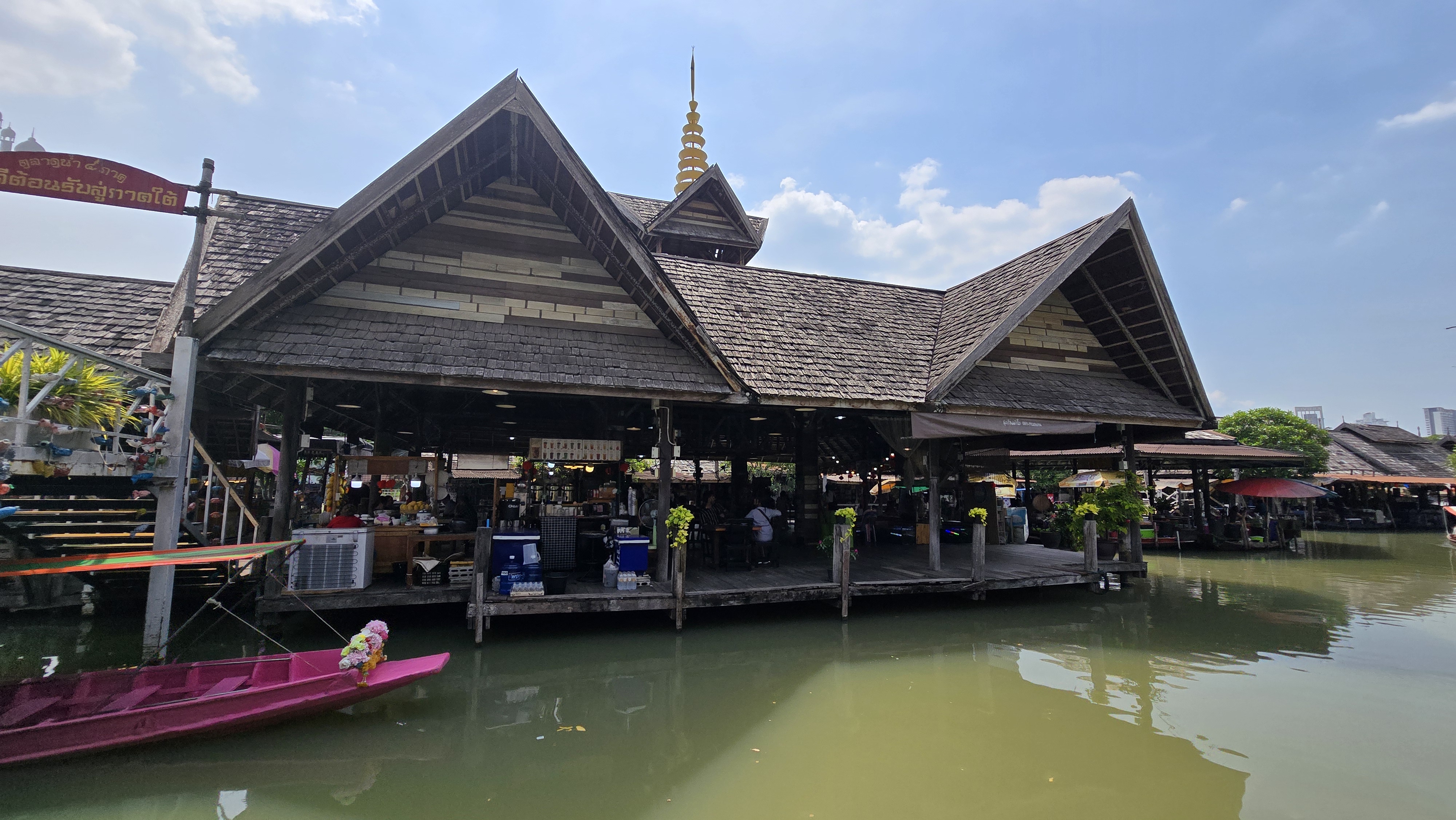 原本預期中的水上市場用餐模式是 – 客人點餐後, 店家在船上煮好端過來。但實際上是老闆把船靠在木板路旁當廚房,老闆自己坐在"岸邊"烹飪而已,桌椅也都是在"岸上"。因為後面還有幾餐是吃到飽,我有點怕第三天就吃壞肚子,這趟來泰國會虧本,所以基本上我很慎選食物,看得多吃得少。