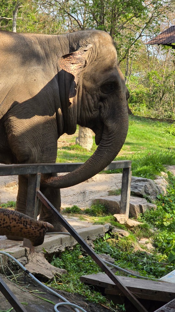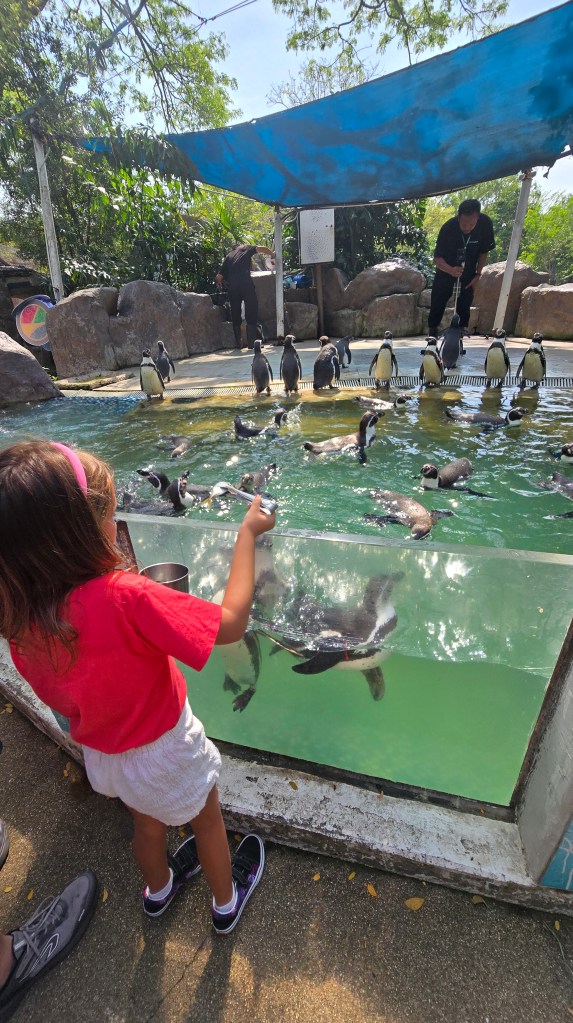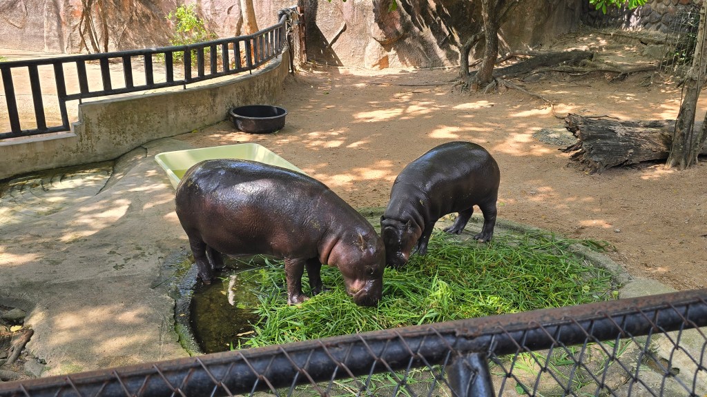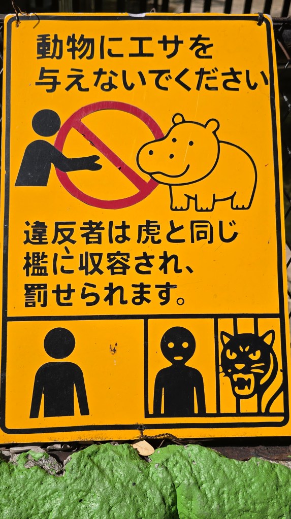 其中,鎮館之寶侏儒河馬 (倒數第三張圖) 就是不能餵的 。警告標語用多國文字寫了:"餵牠要跟老虎關在一起" (倒數第二張圖)。推測這或許跟杜拜貴族去年捐贈了 500 萬伙食費給侏儒河馬幼仔- 彈跳豬 (Moo Deng) 有點關係?