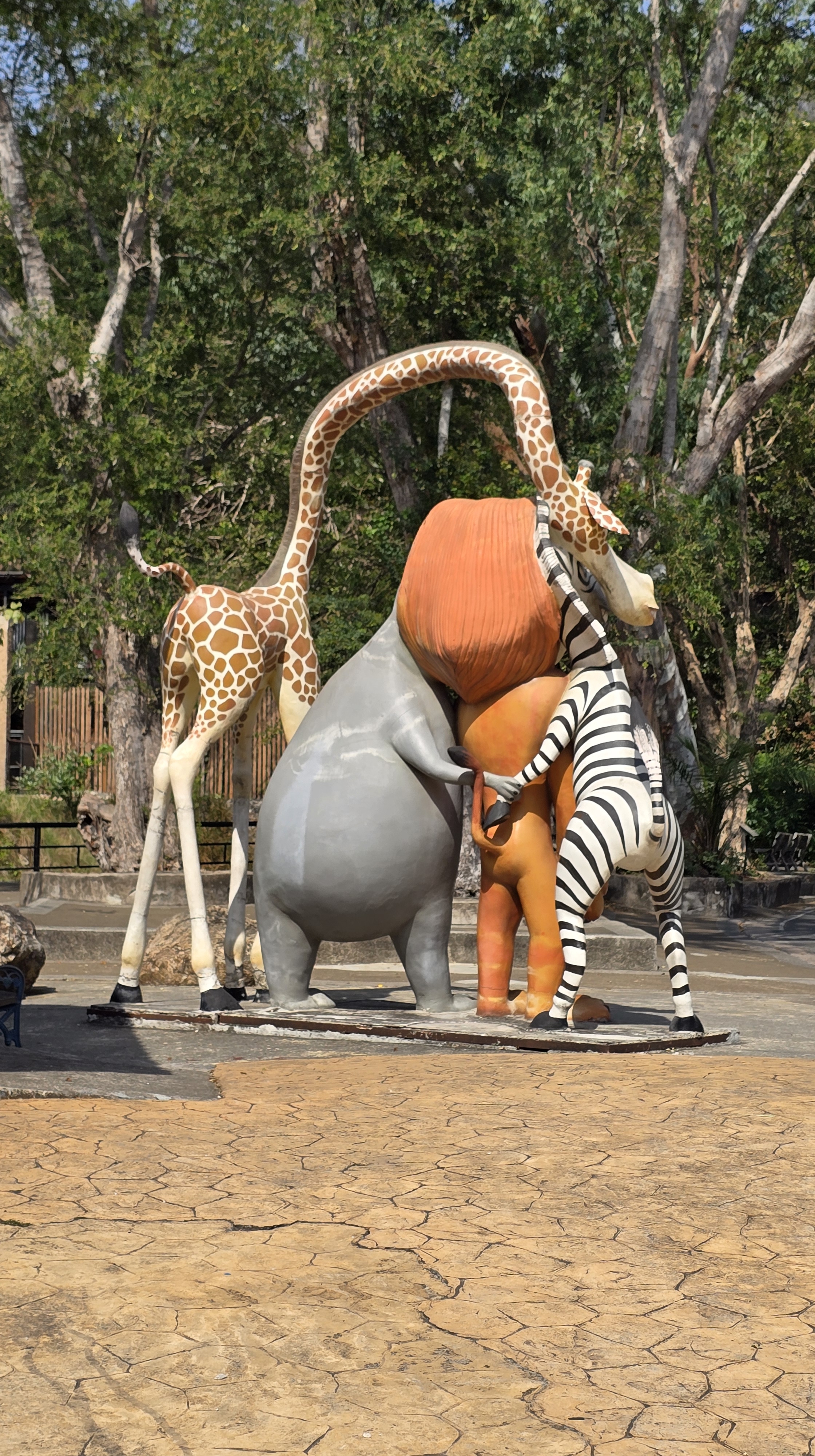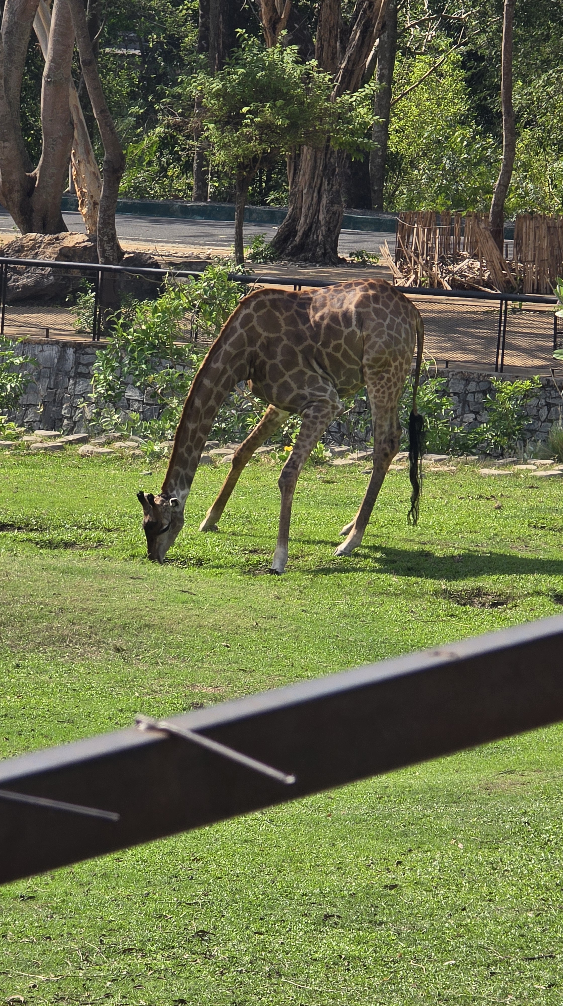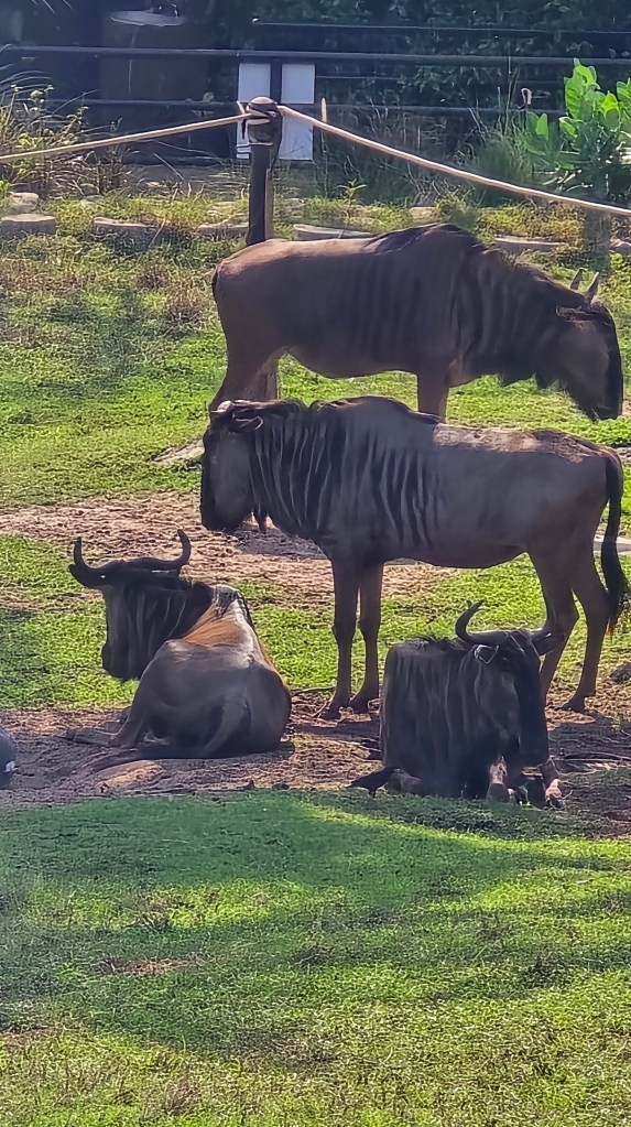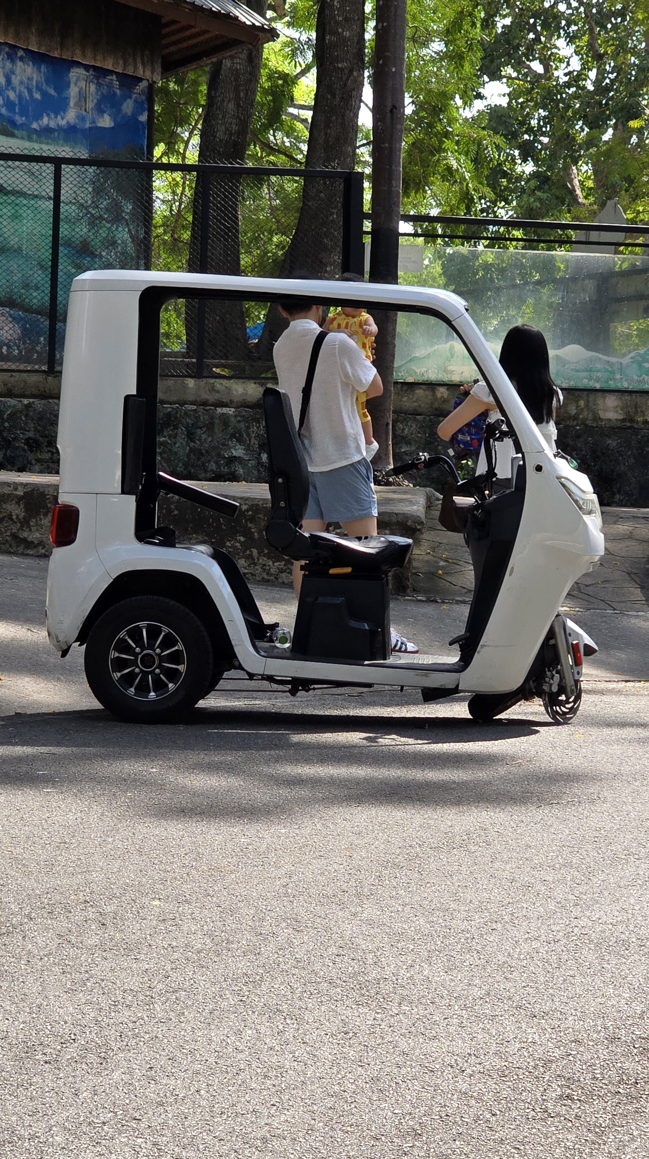 逛完市場後,前往 250 萬坪的綠山動物園。一般來說,動物園應該都差不多。然而這個動物園倒是有自己的特色,像是很多動物都可以自己餵。包括50元可以買五隻魚餵企鵝。至於餵鹿、餵長頸鹿、餵大象都不在話下。除了搭遊園車,也可以租四輪和三輪的高爾夫球車。但四輪的應該穩一點,下圖第一張就是遊客的前輪在下坡時,直接胎皮脫軌,剩下輪圈的慘況。