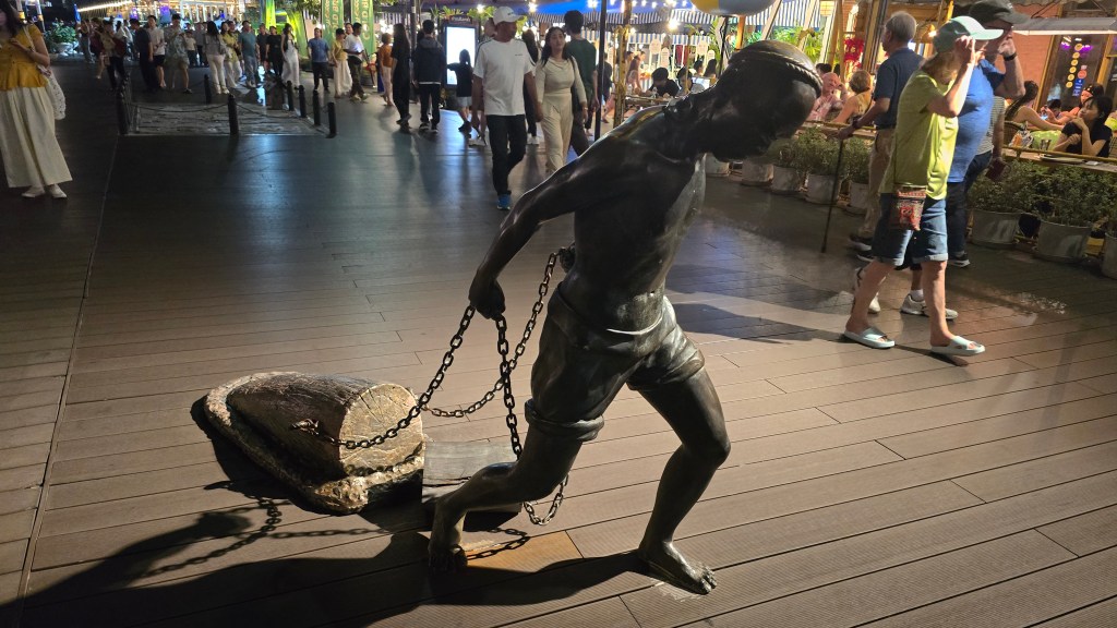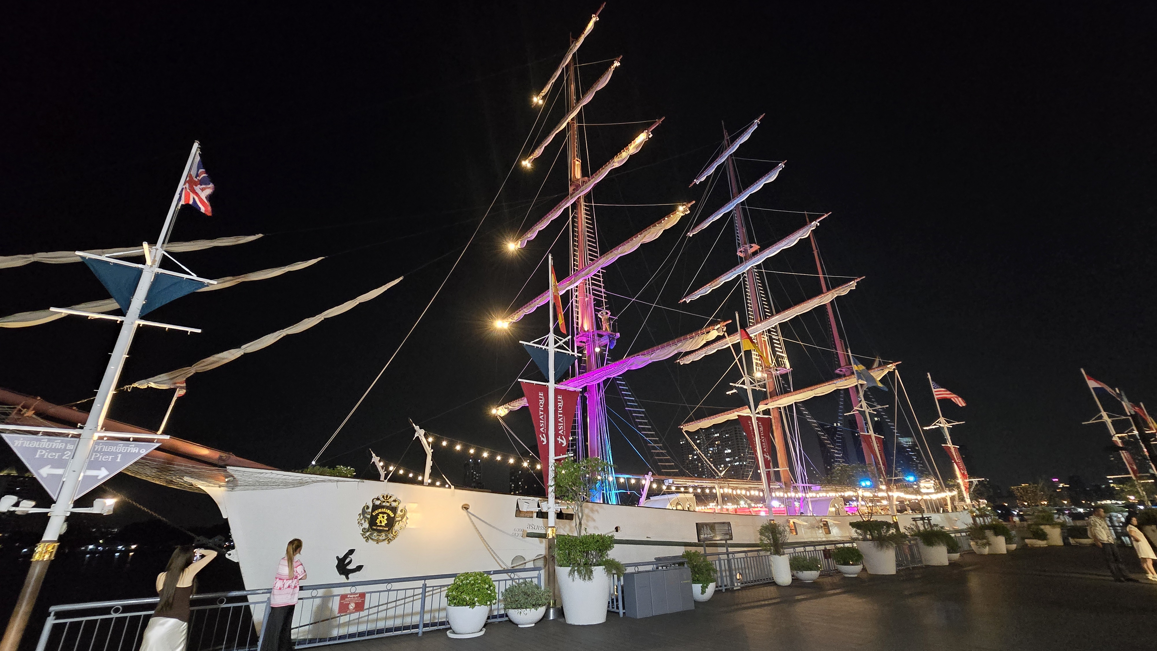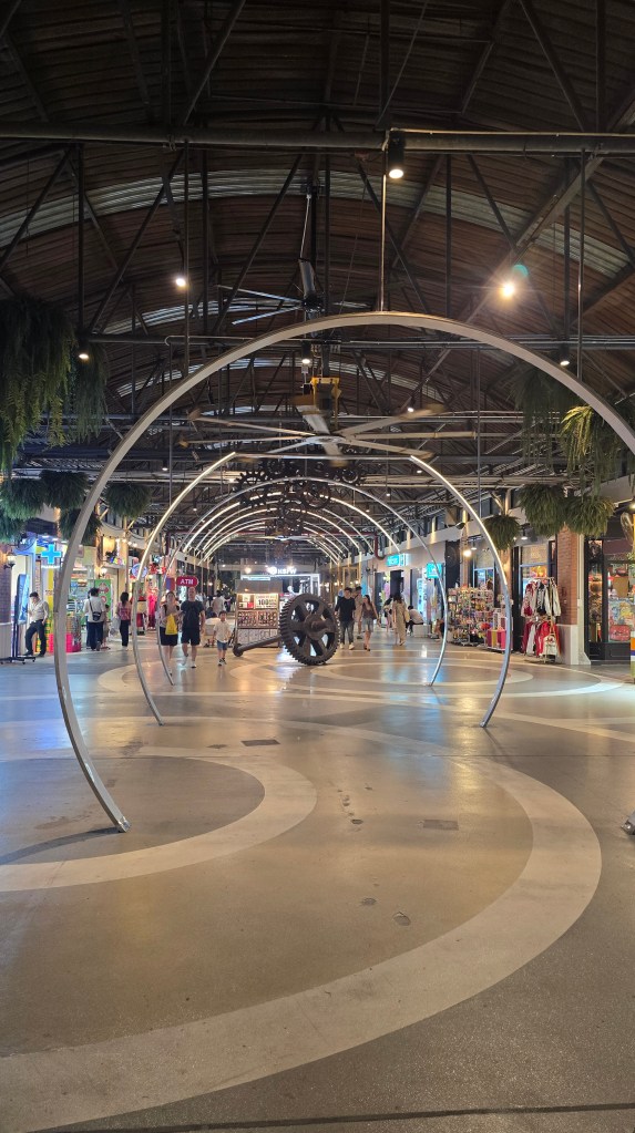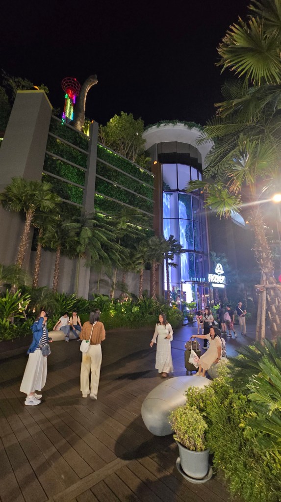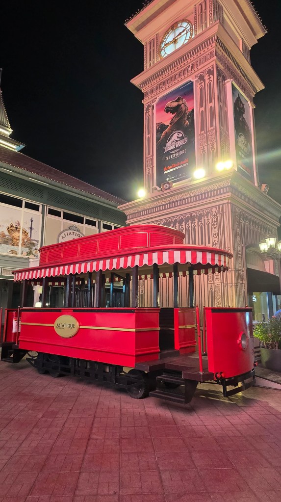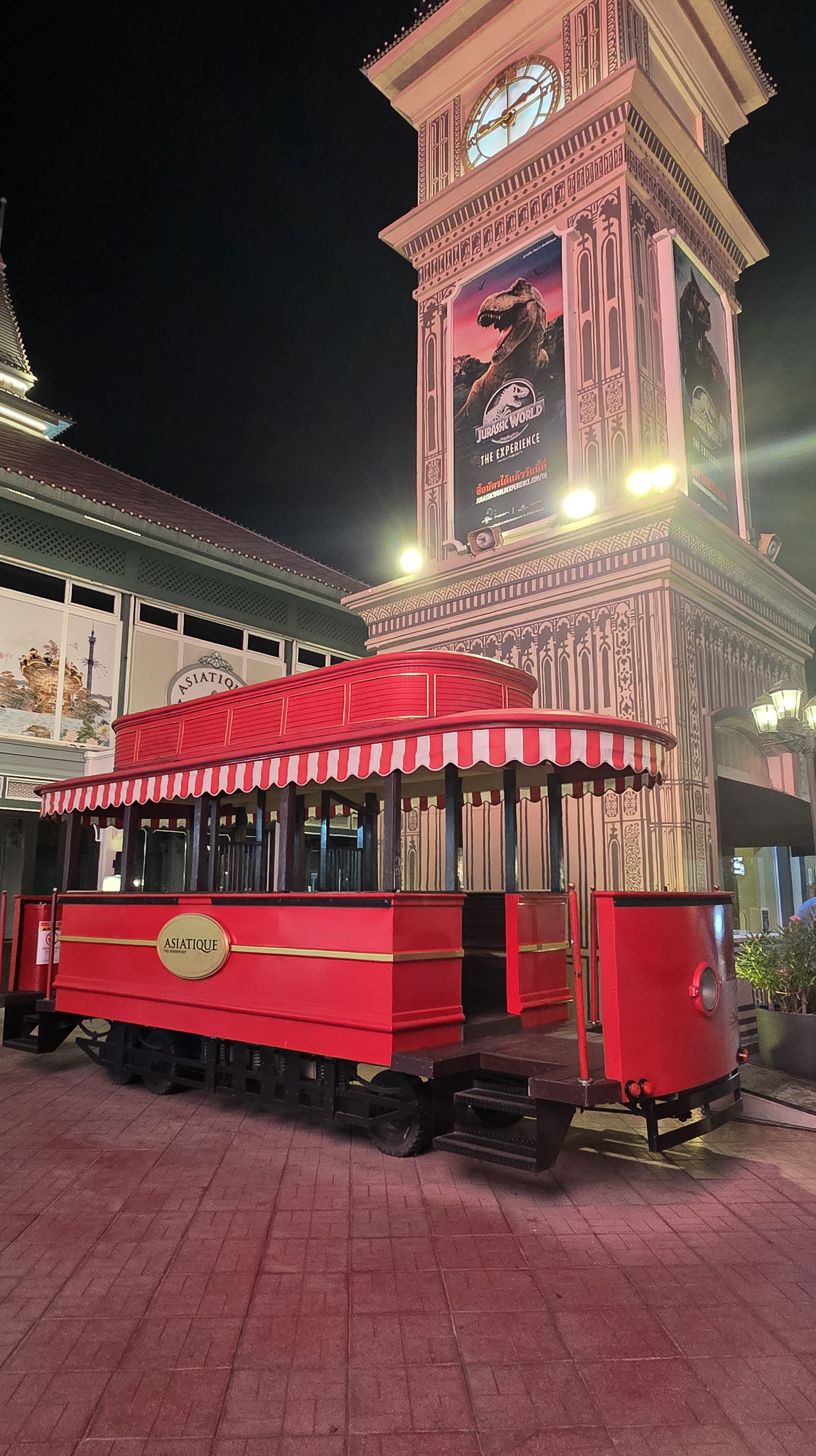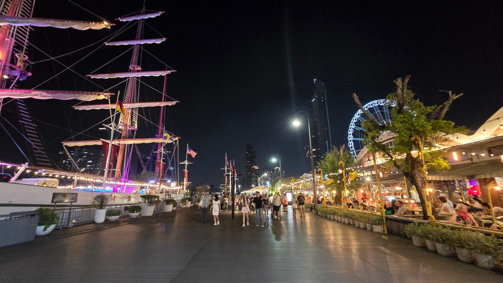 原本以為吃完飯可以休息了。結果還要去逛曼谷湄南河畔的 Asiatique 河濱夜市。這個夜市真的很讚,規劃得很整齊,吃的玩的穿的用的都有。不枉塞了半天的車,堪稱我看過最厲害的夜市。東西的價格有高有低,雖然炸蠍子變成 200元,但衣服反而比水上市場殺價後便宜。如果大家有看到侏儸紀公園主題遊樂區的新聞,也就是在這裡。