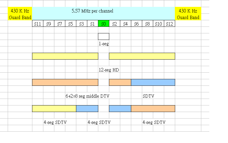 剩下的 12 個 seg, 可以放一個 HDTV 或是多個 SDTV. 能夠接收完整 seg 的接收器 (STB or DTV) 稱為 full seg receiver. 只能收中間那個 seg 的, 稱為 one-seg receiver.
