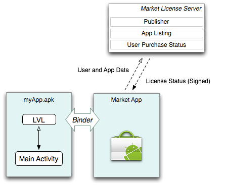 Market client 負責與 market server 溝通, 它會收集 Google Account username, 手機的 (International Mobile Subscriber Identity), 和其他資訊送給 server 確認. Server 檢查過 user 資料, 並且檢查過購買紀錄之後, 就以 call back function 把 license 的狀態傳回給 client.