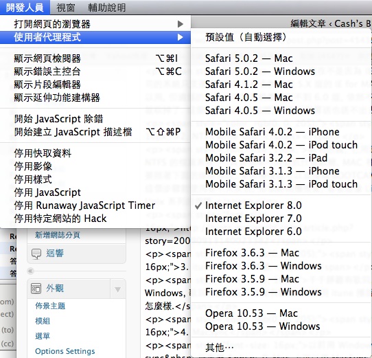 可以假裝是 IE 的瀏覽器有 Flash 8.0 (含)以前的版本, 還有 Safari 的新版. 首先打開 “開發人員" 選項, 然後選代理程式裡面的 IE 8.0 就可以騙過某些網站.