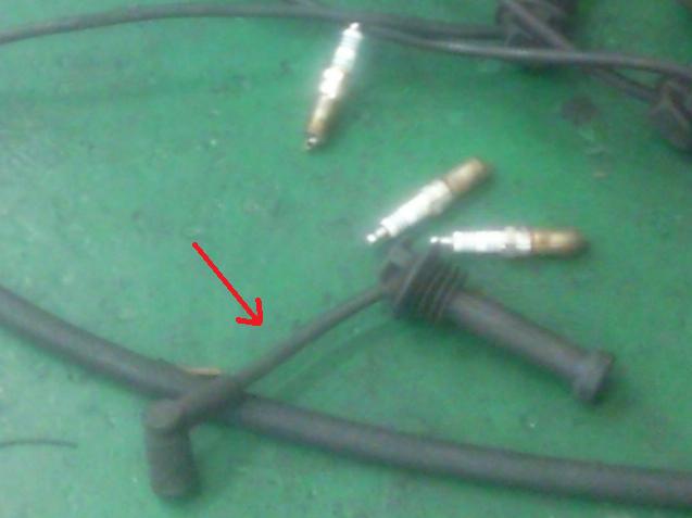 矽導線連接高壓線圈到火星塞, 它外表長得像這樣 – 塑膠外殼的軟線. 修車師父說, 我這個狀況是矽導線漏電. 通常漏電的話, 這根線會有變白的地方. 不過這次他沒有發現.