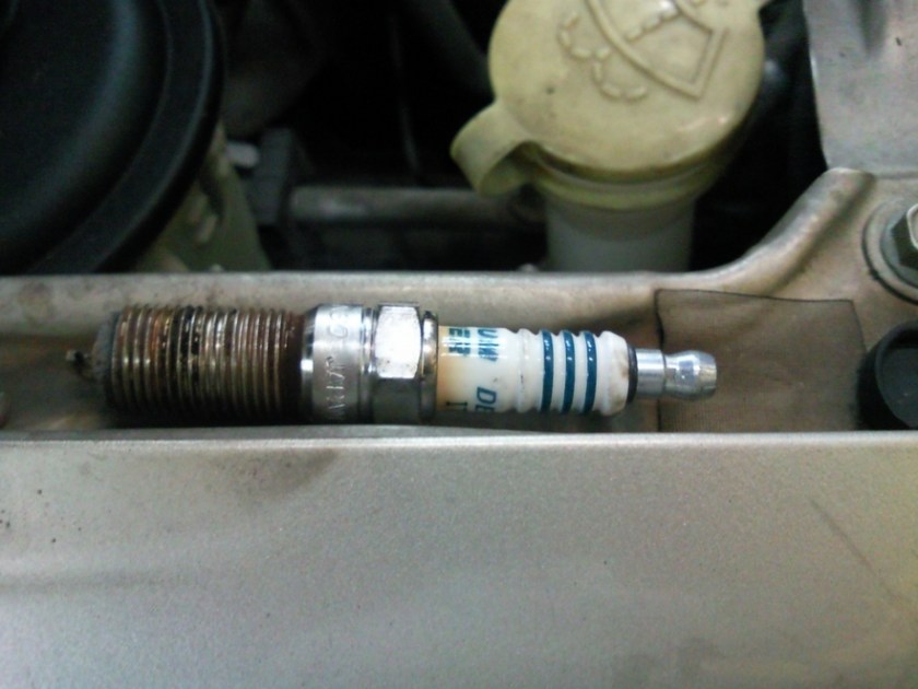 這表示應該在火星塞頂部爆發的火花, 在中段的地方就產生暴震了.  所以火星塞也一起換.