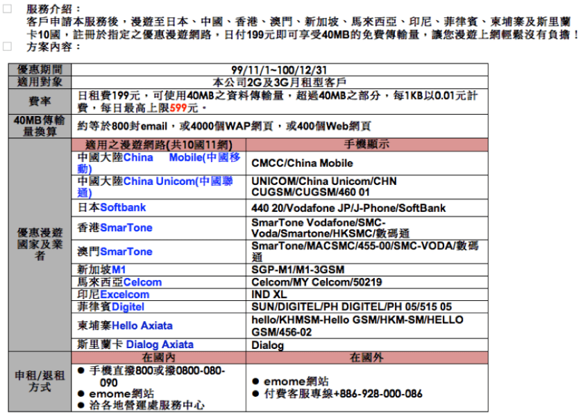 台灣大哥大在 6 月底前有一個促銷方案, 1 天吃到飽 399 元, 3 天 1099 元, 5 天 1799 元. 這個應該是測試市場用的, 趕快支持一下. 希望電信業者趕快降價給我們.