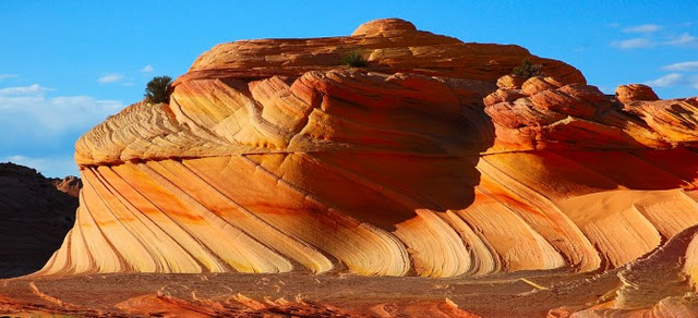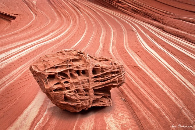 James 介紹的稀奇景點之一是位在科羅拉多高原中心的 Wave. 據說這個地方, 最初知道的人都當做不外傳的私房景點. 直到近年來被德國的電視台發掘, 才變成攝影家的天堂. 據說它是含鐵和不含鐵的風砂交錯堆積後, 經過陸沉再升起於地表. 最後這些岩石就變成脆弱的風化石, 並且帶著不可思議的天然紋路.