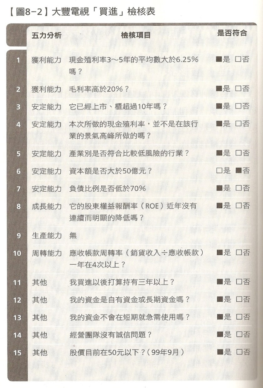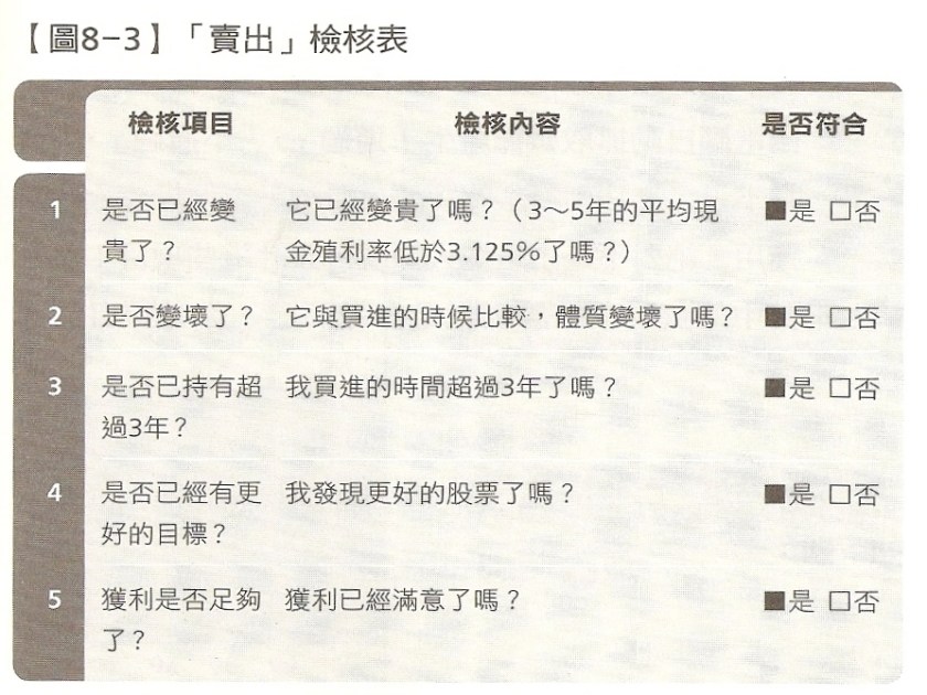 上面講的東西都很基本, 比較重要的作者有好幾張表格可以管理選股或是檢視是否應該出脫股票. 講理論大家都會, 但是有個表格來檢查還是比較有紀律的執行方式.