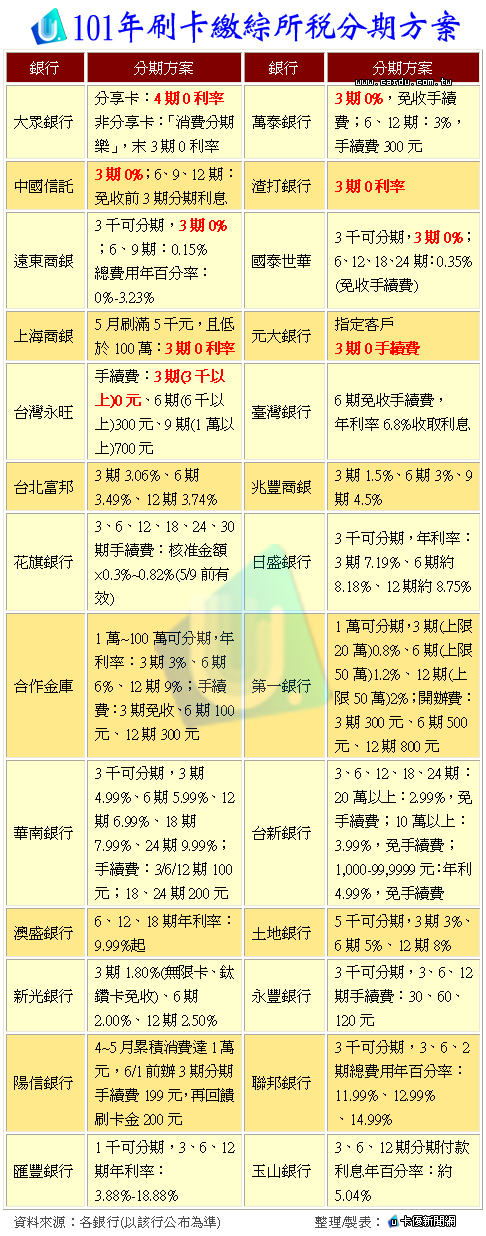 本來我想比一比今年刷哪張卡繳稅最優惠, 原來人家已經都整理好了. 在不需要收手續費的情況下, 那麼最有利的狀況就是 0 利率的分期付款, 或是有額外的好處. 整理較優惠的方案如下: