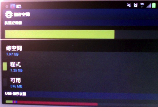 第二個重點就是: 設定 / 儲存空間 / 裝置記憶體 / 總空間變成 1.97GB 了. 我記得它的規格就是 1GB, 以前看也是 1GB, 升級後竟然變成 2GB 了. 而這 2GB 已經用掉了 1.5GB, 也就是我還是只剩下 516 MB 可以用. 所以我猜這是 bug 吧!