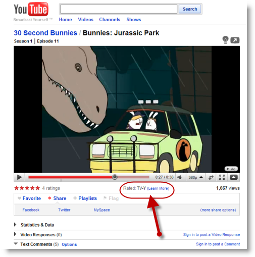 至於經過分級的影片或是遊戲, 這是通常大家認知的 Parental Control, 它也是靠密碼保護. 這些分級的內容通常在影片網站上已經預先分類完畢, 像是 Youtube, 網樂通都是如此. 下圖的分級資訊如紅色箭頭所示.