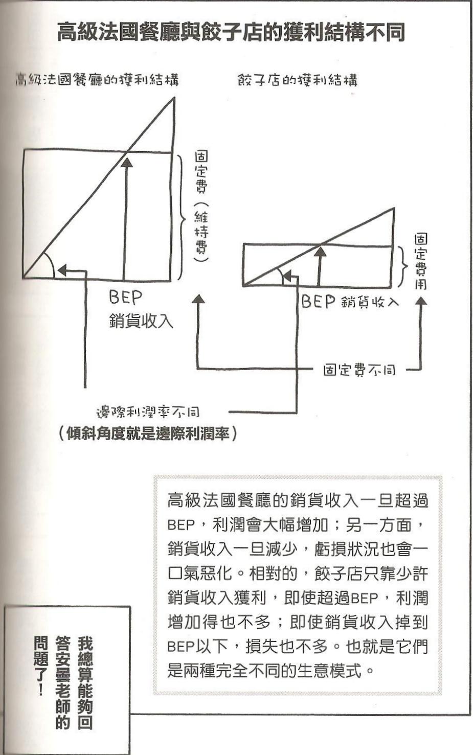 第五章, 餃子店與高級法國餐廳哪個賺錢? 餃子店的損益兩平點比較低, 要賺也賺不多, 但虧也虧不到哪裡去. 反之法國餐廳的損益兩平點較高, 不是大賺就是大虧. 為了彌補固定費的開銷, 必須抓更高的毛利.