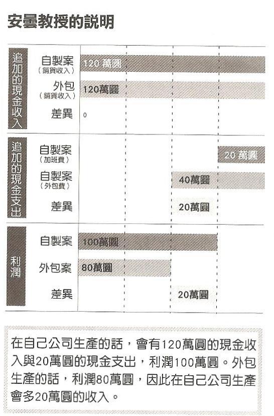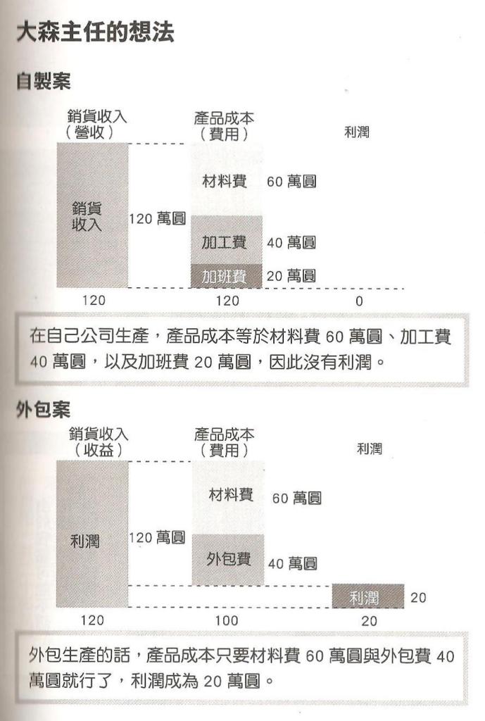 因為公司生產的費用是沉沒的成本, 所以外包之後仍然要花這麼多錢. 如果多花加班費就可以搞定, 完全沒有外包的必要. 我想此處的例外是搬廠到海外, 日本總部就此關閉, 或是外包商有獨特的技術; 在此兩個條件下, 外包或是設廠就有意義.