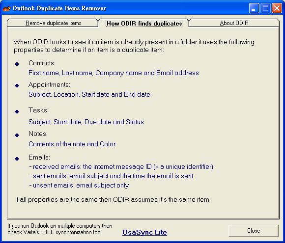 幸好, 還是有聰明的免費工具可以選擇. 我找到一個 VAitA 出品的 Outlook Duplicate Item Remover.  安裝它之後, 它在 Outlook 裡面會產生一個 ODIR 的按鍵. 點選此鍵, 會跳出一個應用程式, 我們就用它刪除各種重複的項目, 包括行事曆, 信件, 聯絡人, 工作, 筆記等等.