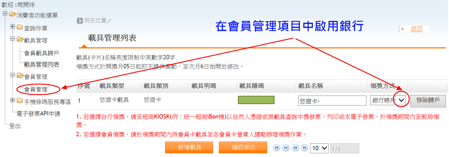 把優遊卡載具登錄完後, 在財政部電子發票整合平台的載具管理列表中, 看到自己已經登錄的悠遊卡的領獎方式竟然只是 “自行領取"? 這怎麼行呢? 原來還要在會員管理那項裡面啟用銀行帳號, 接著才能看到悠遊卡載具可以選擇 “銀行帳戶". 差點因為沒有啟用而功虧一簣.