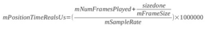 1. 首先我們要知道依據播放器的時鐘, 我們已經播出了多少微秒. 請注意下面的 mSampleRate 其實是 frame rate. 這樣算出來的單位才會是秒, 乘上 106 就變成微秒.