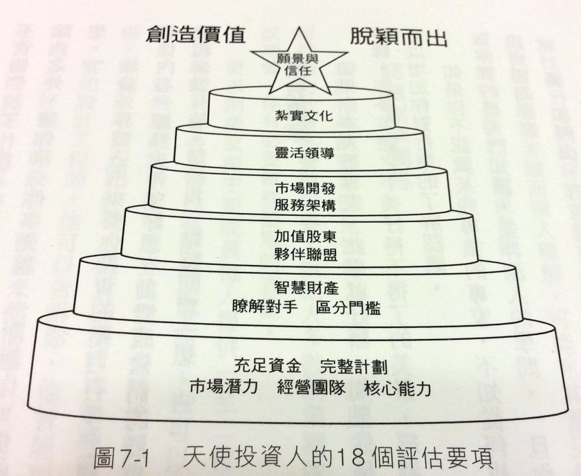 後來收穫更大的是投資一家法國人開的公司. 這位法國人是搞光電的博士, 原本作者對老外沒什麼信心,後來拜訪他們家後, 斷定對方是一個真正的技術狂, 因此勇敢地投資了這家 Light Logic. 後來這家公司被 Intel 買下, 作者靠它回收一百倍.到了千禧年,作者也不再單打獨鬥了, 他和幾個志同道合的天使,創立了橡子園創投育成中心.天使們結伴打群架讓他們的實力可以和創投媲美.說到要如何找到值得投資的明日之星, 作者列出了十八項檢驗標準.至於要當個天使投資人的話, 作者建議身家達到數百萬 USD 的程度, 可以拿一百萬美元出來投資, 若有三千萬美金的身價則比較輸得起.