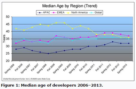 根據上圖的資料, 北美地區的工程師年齡中位數從 2006 年的 40 多歲, 逐年攀升到超過 45 歲. 但是 2009 年 “做頭" 之後, 已經跌落到 35、36 歲左右. 中位數從 46 歲降到 35 歲, 表示電腦工程師圈更加年輕化, 甚至比 EMEA (Europe, the Middle East and Africa) 還年輕. 反之, EMEA 和亞太  (APAC) 區的電腦工程師為了養家活口、但又還沒達到可以退休的水準, 只好逐漸在職場變老 (本人也有貢獻). 兩方年齡層已經愈來愈接近.