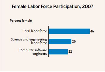 再來關心一下女生, 在一般行業裡面, 女性佔 46%, 但在電腦工程師的行業裡, 女性只佔 22%. 所以即使是在男女比較平等的美國, 大概 5 個工程師當中才有一名女生.