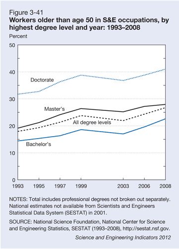雖然前人講的是真的. 在不到十年前的 2006 年, 美國電腦工程師隨便亮出一個可能都比台灣大 15 歲. 但這個差距到 2013 年春天, 已經縮小到 5 歲左右了. 由於全球化愈來愈明顯, 典範轉移或是工作外包使得地球變得更平. , 加上美國嬰兒潮 (1945~1964 年生) 屆齡退休, 職場的中高齡工作者人數銳減. 我想過去的鐵律已經不能當作今日的標竿, 不分中外, 呃….不分台美, 以後看到的工程師中位數就是 35 歲上下, 而未來國外的軟體工程師不見得能比台灣做得久. 如果想要在職場撐久一點, 博士學位似乎是不錯的護身符. 資料 [3] 指出 50 歲以上 S&E 從業人員有 4 成是博士 (下圖), 但明明讀博士的人只佔市場上 10% 以下.