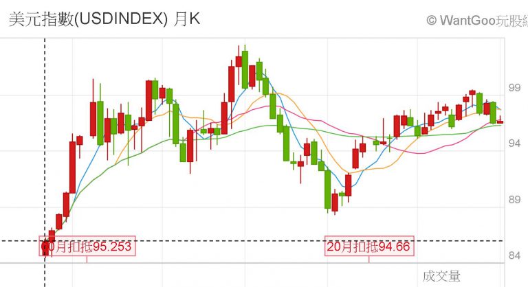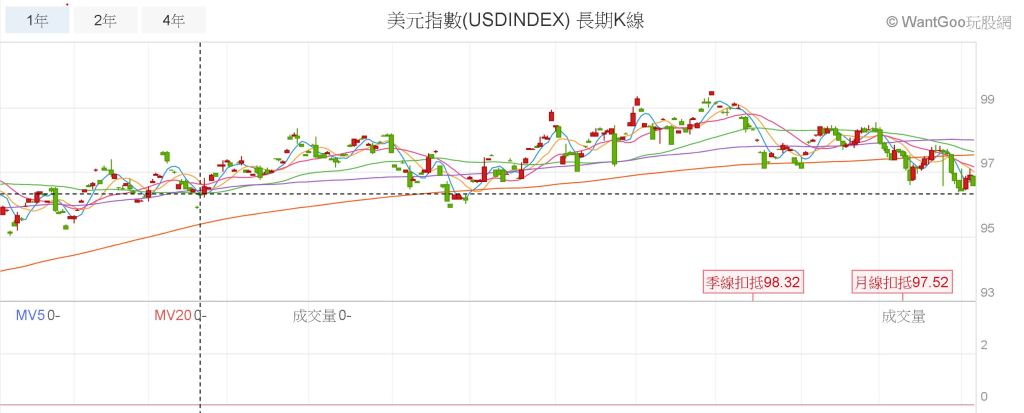 雖然台幣不在公式裡面, 但兩者趨勢一樣嗎? 從玩股網 [3] 抓了一張美元指數 1 年日K 線放在下圖.