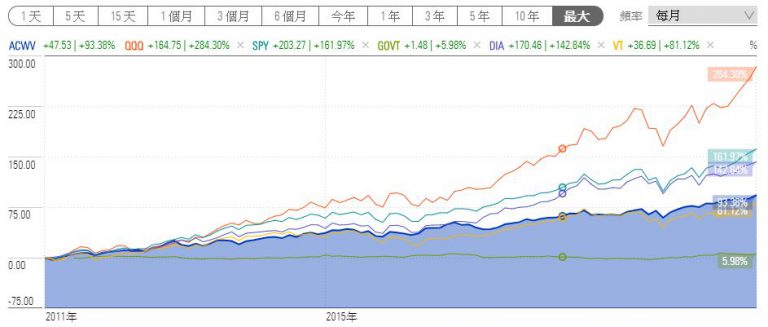 如果買全球股票 VT[1] 或是全球低波動股票 ACWV[2], 那麼股價漲幅各為 81.12% 和 93.38%. 這可以視為很不貪心的投資組合. 差別在於 VT 裡面一大堆美股, ACWV 權重最高的則是歐洲的雀巢(NESTLE SA). 如果買一堆美股 ETF 了, 再搭 VT 不如搭 ACWV. 兩者的殖利率大概是 VT = 1.8775/81.19=2.3%, ACWV = 2.436142/97.83=2.5% (按 2020/1/28 收盤價). ACWV 的缺點是規模小很多. VT 的規模有 18,500 M USD, ACWV 只有 5,645.08 M USD.