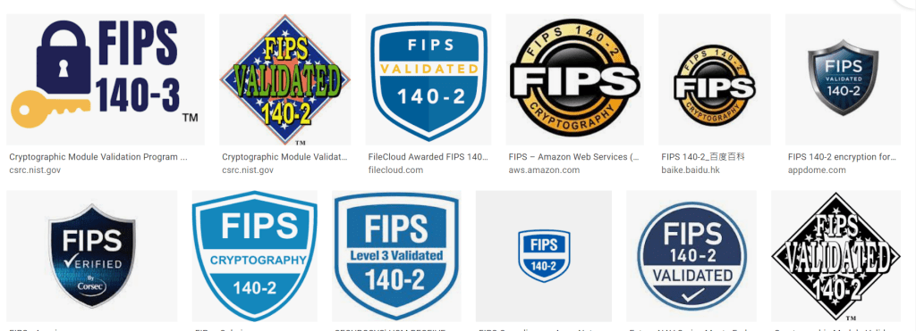 如果通過 FIPS 認證會拿到一個標章. Goole 後就會發現這 logo 居然可以有很多不同的長相. WolfSSL [4] 說: 號稱 FIPS-140 ready 或是 Design for FIPS 都是混淆視聽, 正版 logo 要通過NIST [5] 認證才算數. 所以標準長相是下圖的前兩個和右下黑白那個 (140-3 和 140-2) [6].
