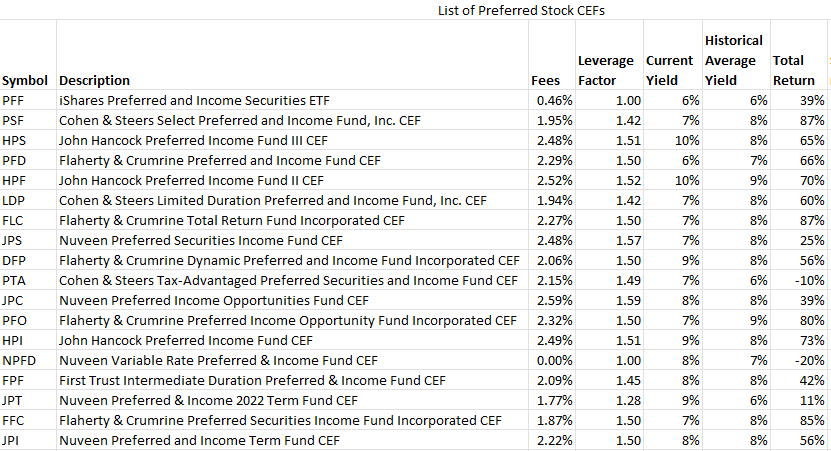 根據 [8], 購買優先股可以獲得 5.6% 的殖利率, 但 CEF 優先股可以獲得 7~9% 的殖利率. “Preferred stocks that are bought individually—that is, outside of a fund—yield 5.6% as I write this. But purchasing through a CEF can upsize that payout to 7%, 8%—even 9%." 這是什麼魔法呢?