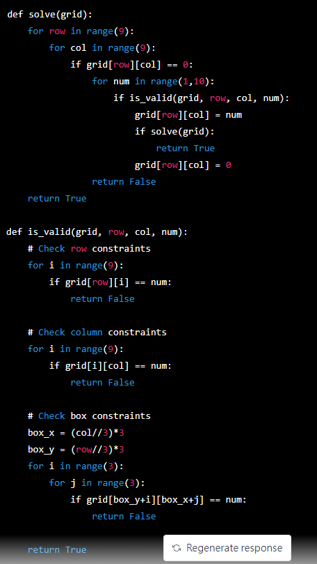 接著我發現電腦的 ChatGPT 窗口還沒關, 順便就問它, “can you resolve a sudoku?", 然後奇妙的事情發生了. 我知道 ChatGPT 會寫程式, 但我只是隨 “口" 問問, 它就把程式寫好了. 看來不只是可以幫我們交訓練課程的心得報告而已. 連我們以後上機考試要更嚴格防弊了….哈!