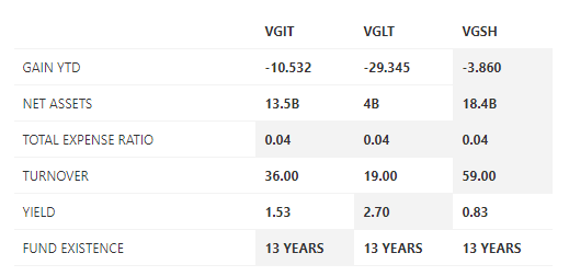 先偷瞄過, VGSH (短期國債) 和 SHY 的波形幾乎一模一樣, VGLT (長期國債) 和 TLT 也是一個樣. 所以三組各派一名代表來 PK 就行了. 借用 [2] 這個網站, 我們得到下圖: