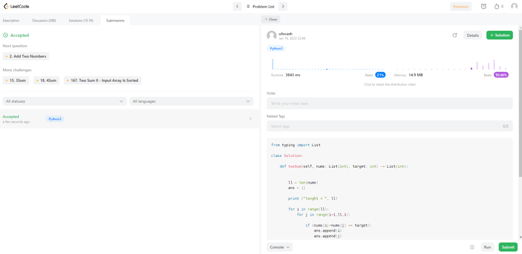 Accept 之後, 系統還會說明執行速度和使用 memory 兩方面贏過多少人? 這個要拚的話當然是可以再努力. 不要 init class 也可以變快一點 (^^). 另外, 我傻傻地用初學時的 Jupyter Notebook 打草稿, 這樣連 list 都要 import 才編得過. 但是在 LeetCode 卻都可以忽略. 果然是有差!