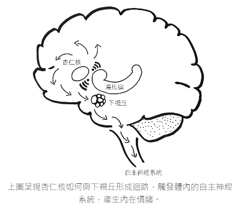 杏仁核、海馬迴、下視丘 (又稱下腦丘, hypothalamus) 三者的連鎖反應構成全身性的記憶. 當我們的杏仁核像火星塞一樣點火的時候, 所有的相關資料會匯集到下視丘. 下視丘再決定送什麼資料 (如皮質醇濃度) 給自主神經系統 (autonomic nervous system). 可能是一見鍾情, 喜歡到昏倒. 也可能是太過害怕, 嚇到全身發抖. 這些都是理智所無法控制的身體反應.