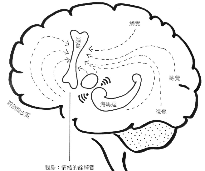 接下介紹很少人聽過的腦島 (又稱作島葉, insula). 它的功能是情緒的詮釋者. 我們可能難過得大哭, 也可能喜極而泣. 在同樣身體反應下, 背後情緒的不同就是由腦島翻譯的. 第一時間我們的反應來自神經細胞-杏仁核-海馬迴-大腦皮質, 第二反應來自神經細胞-前額葉皮質-海馬迴-大腦皮質, 第三個反應來自前額葉皮質-腦島. 雖然怕還是要做, 雖然難過還是要堅強, 這就是腦島大致的功用.