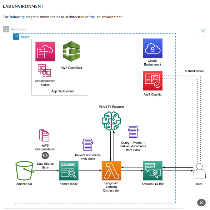 Step 3: 賦予語音文字轉換的能力. 採用的套件是 Amazon Lex, 也就是上圖下方偏右的綠色方塊. 預設它的 Inten (意圖?) 會叫 Kendra 去 search. 等等! 那 LLM 在幹啥? 原來會把問題和 Kendra 打包去問 LLM. 官方課程說明如下: