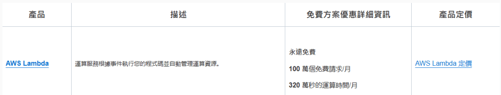 Step 5: 做好的 Docker 放在哪裡跑呢? 當然要順便推銷一下 Amazon Lambda [2]. 它號稱不用佈署後台就可以執行, 而且有免費方案.